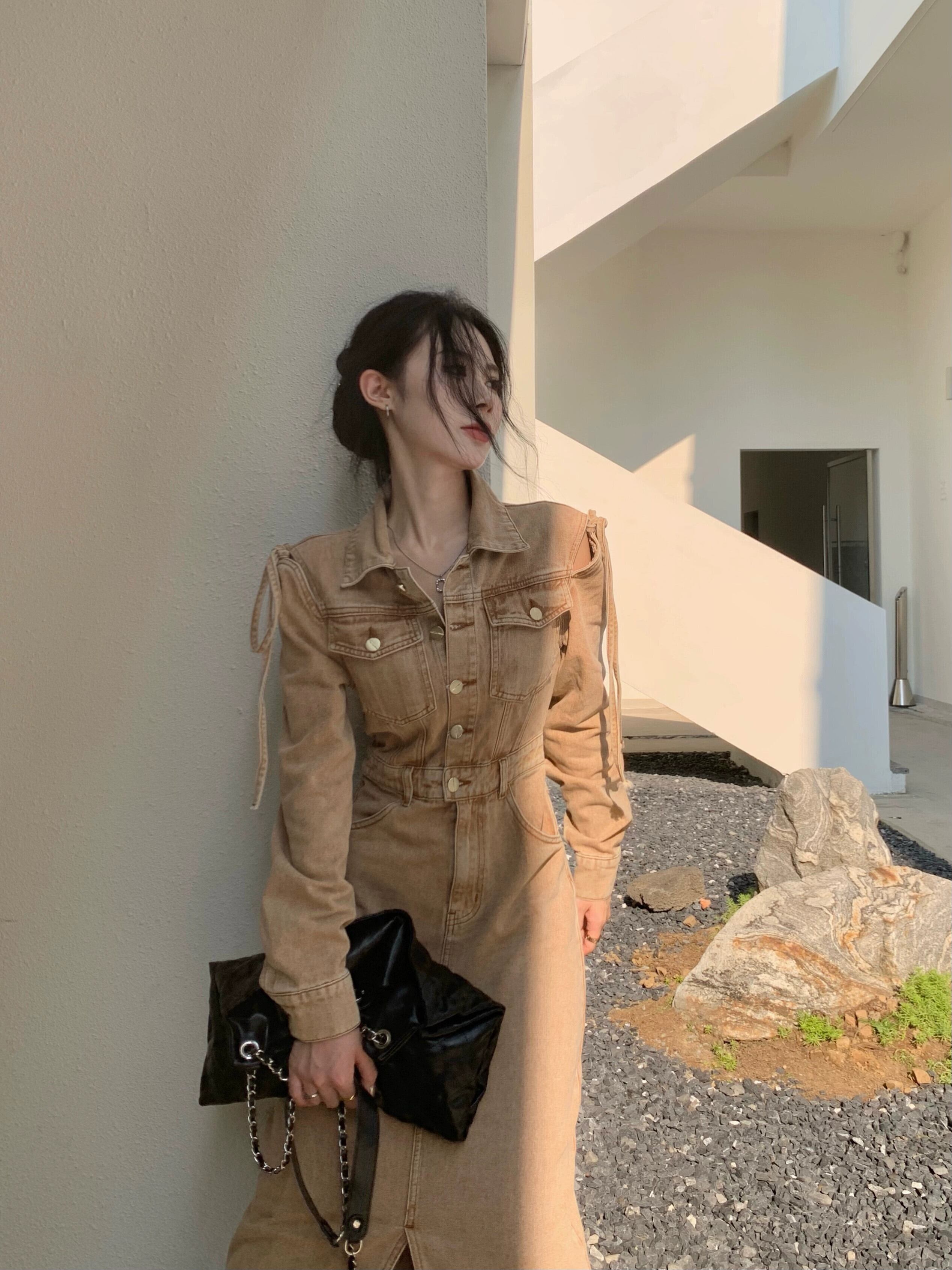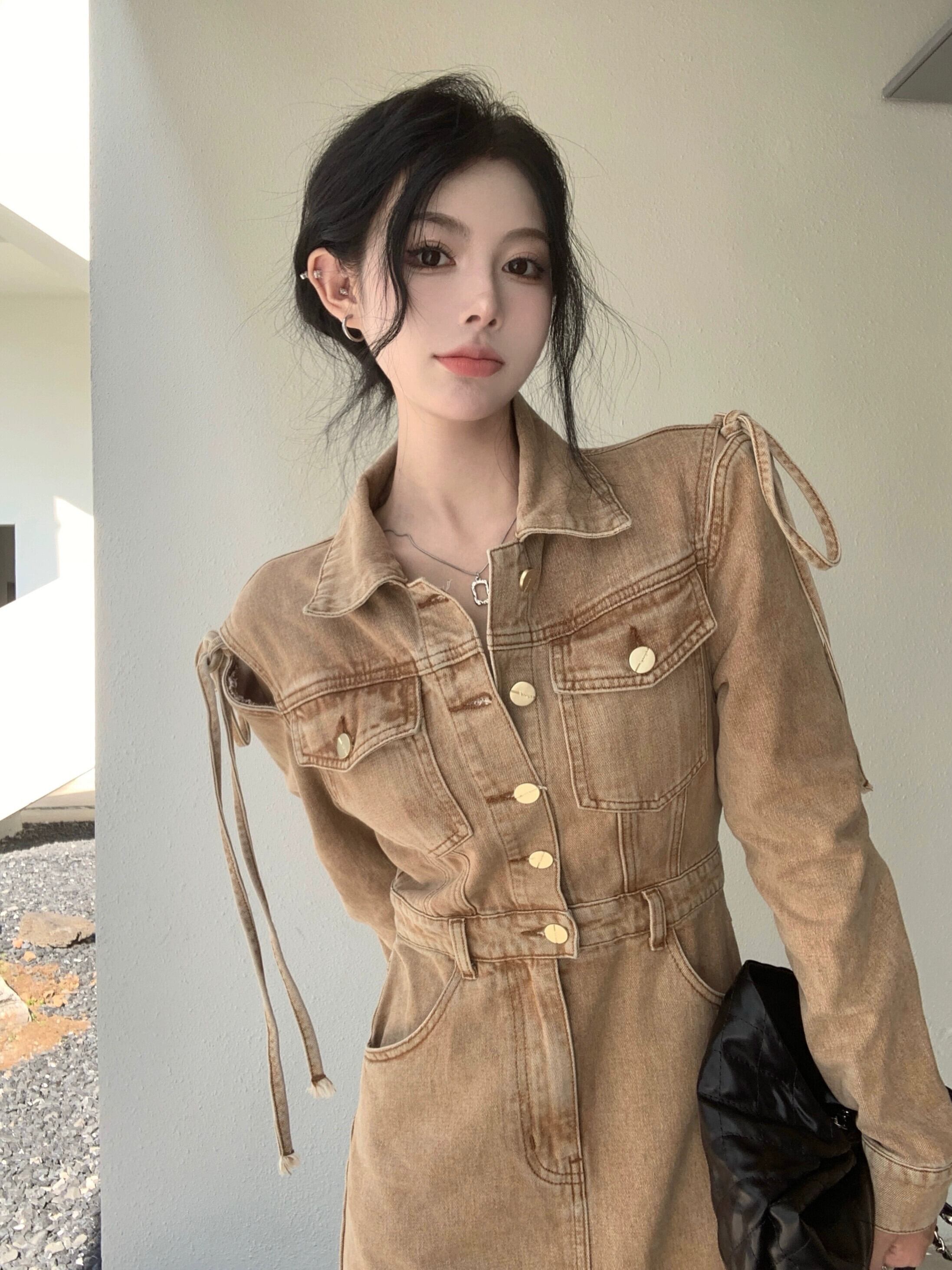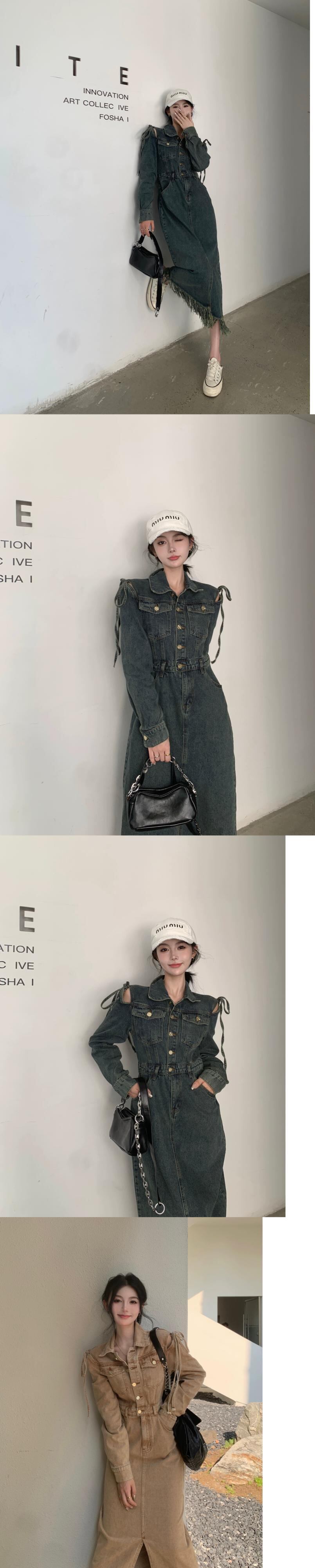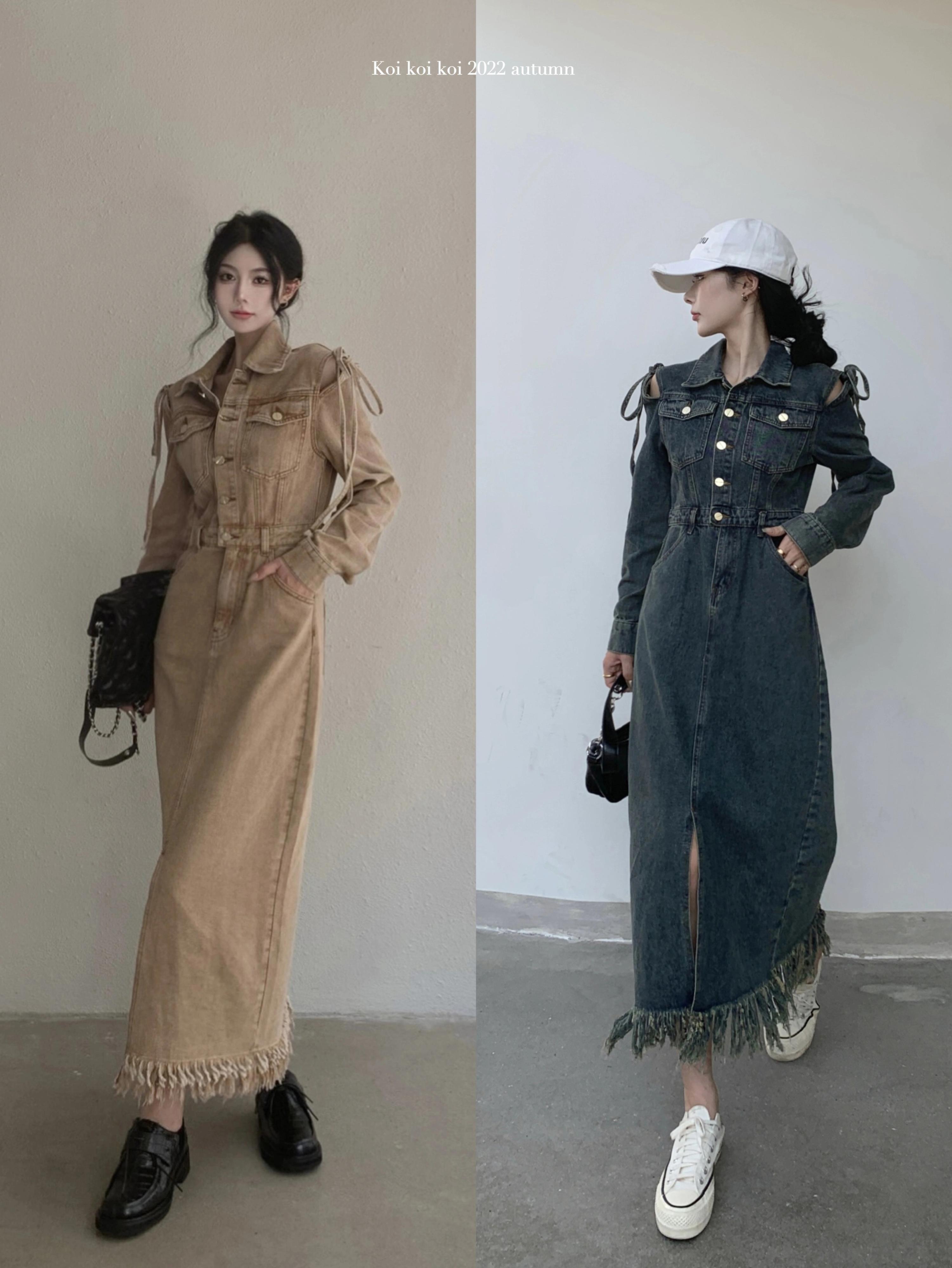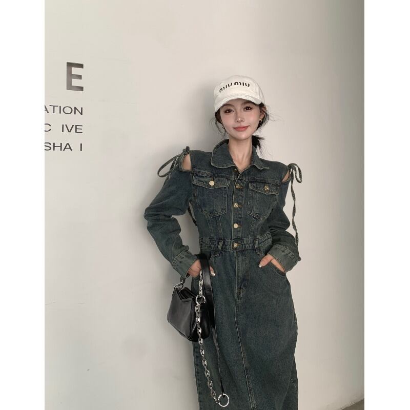 香港スタイルのレトロなストラップレスデニムドレスの女性の 2023 冬の新しいハイウエストスリムミッドレングススリットスカート ハイウェスト ウィンター 冬物 0921912382491994
