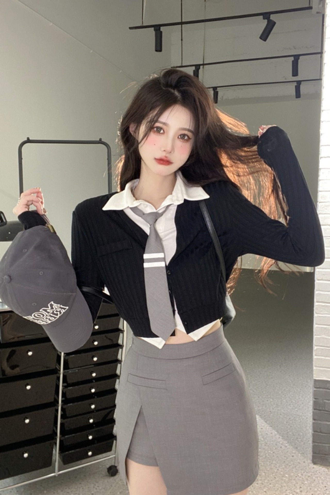 色:白のシャツ,グレーのスリットスカート,ブラックカーディガンワンピース