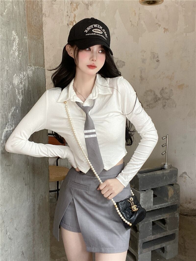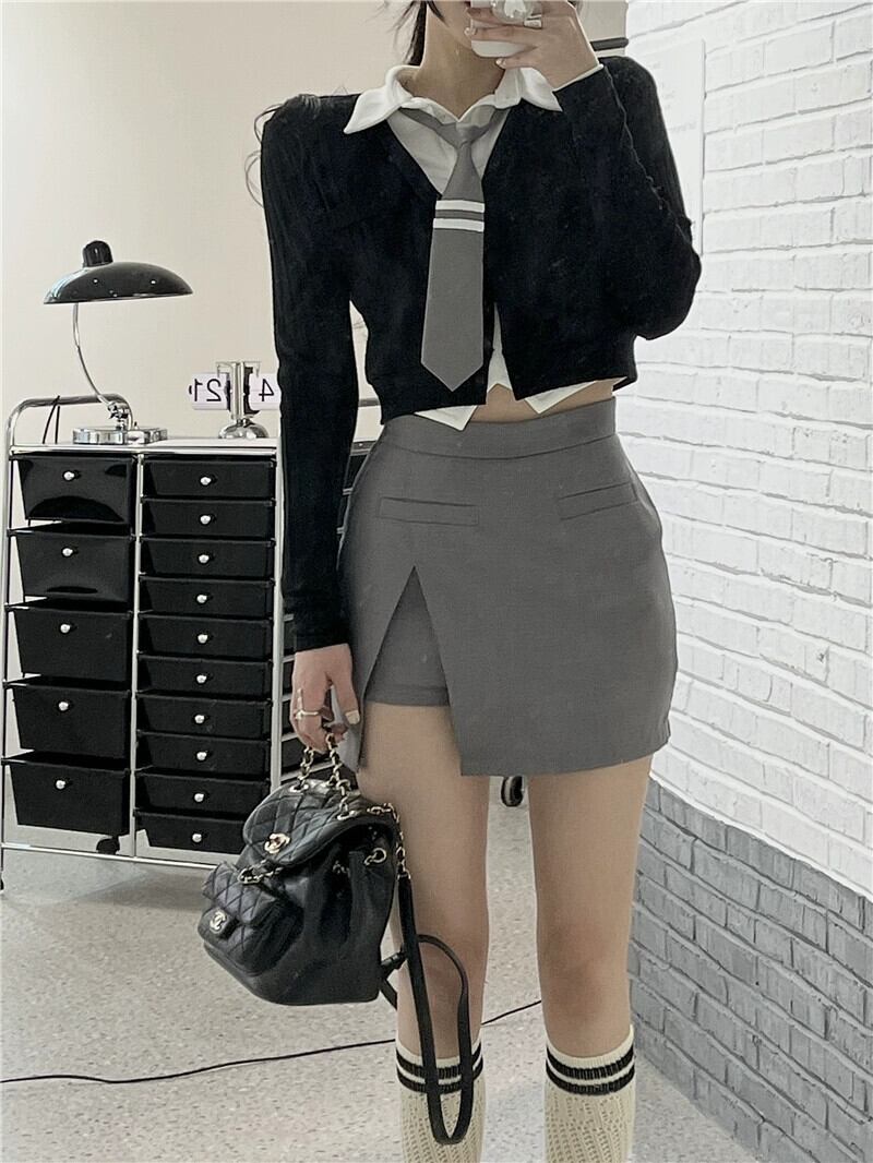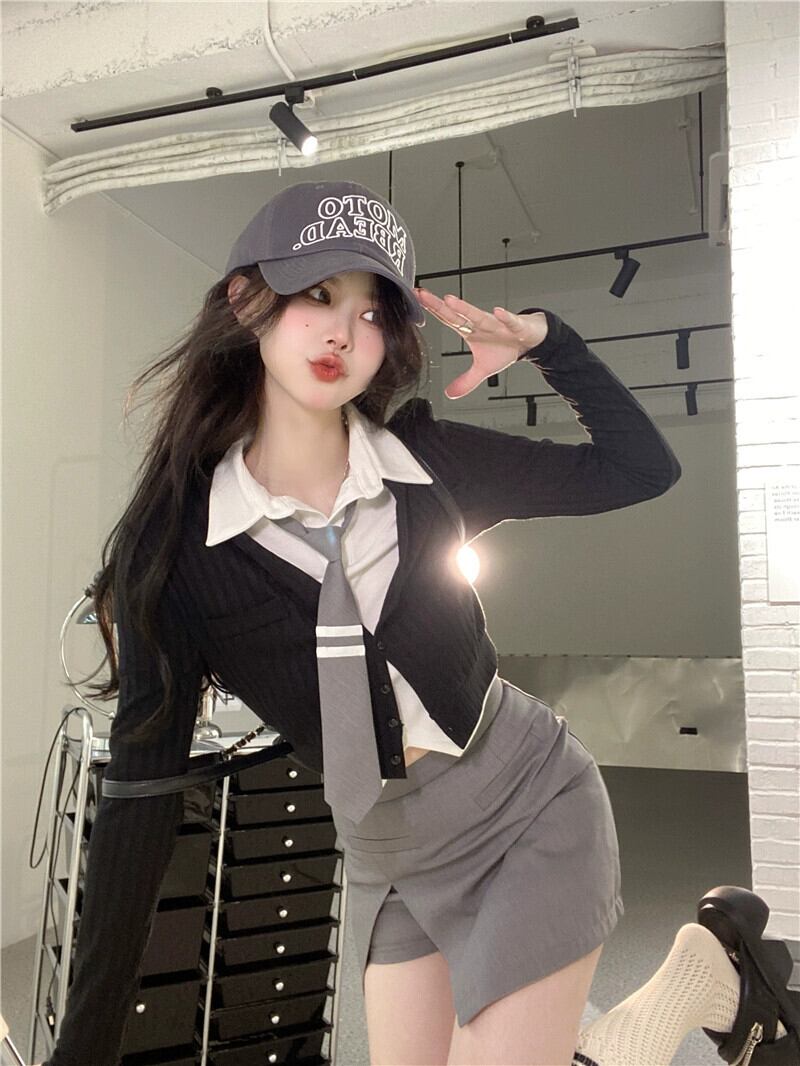 純粋な欲望カレッジ風スーツスカート女性 2023 春の新作ニットカーディガン長袖シャツスリットハーフレングススリーピーススーツ ロング スプリング 春物 092191630708918