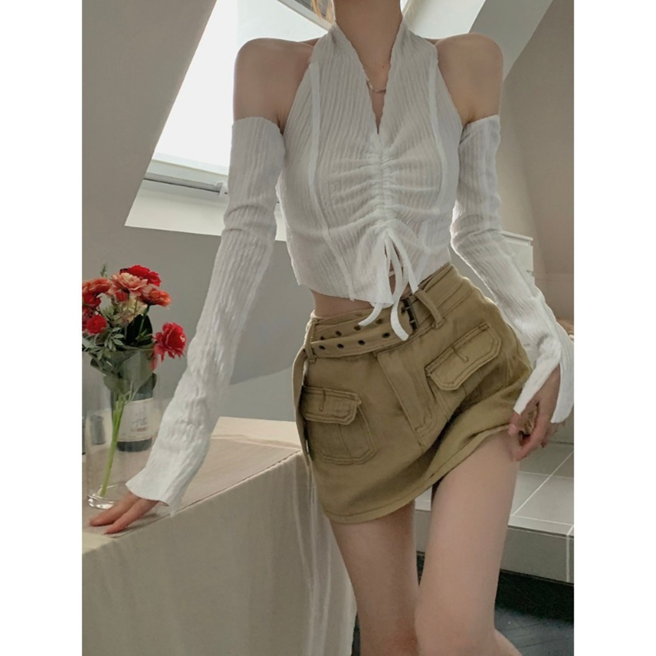 インセクシーな吊りネック V ネック Tシャツ女性初春 2023 新デザインセンスニッチスリーブスリーブショートトップトレンド スプリング 春物 Vネック 0921970754237245
