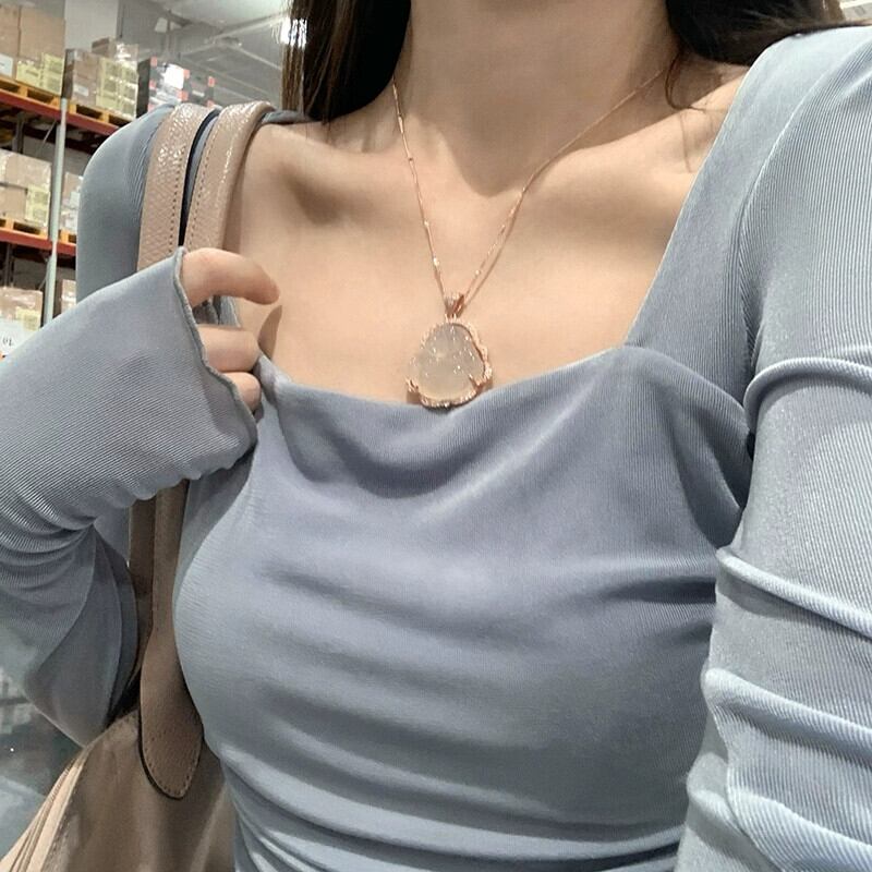 純粋な欲望ミルクブルースクエアカラー長袖 Tシャツ婦人服 2023 春の新スタイルスリムショートニットトップ ロング スプリング 春物 スクウェア 0921919108012098