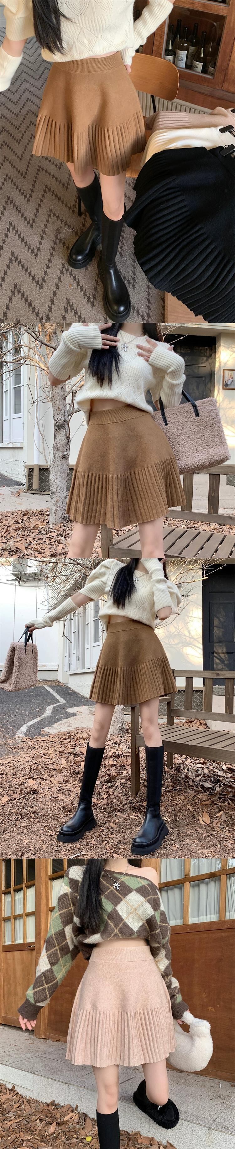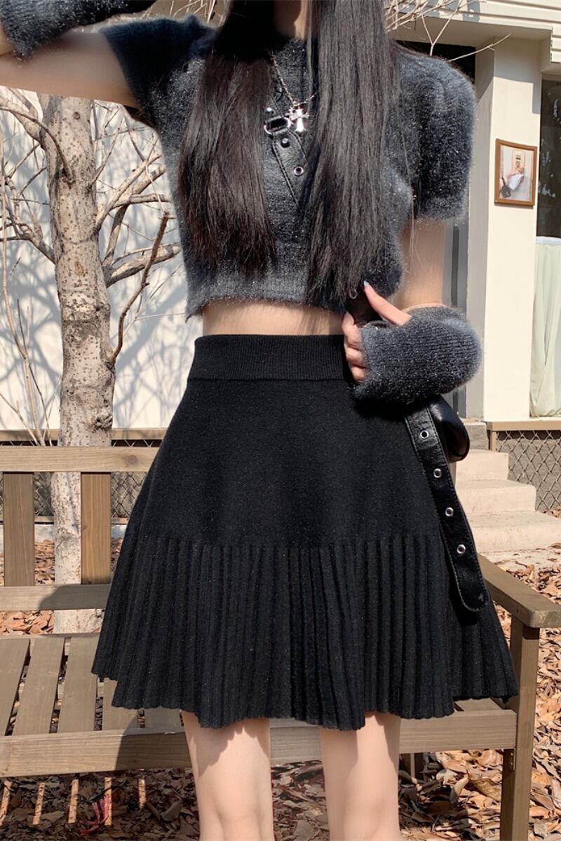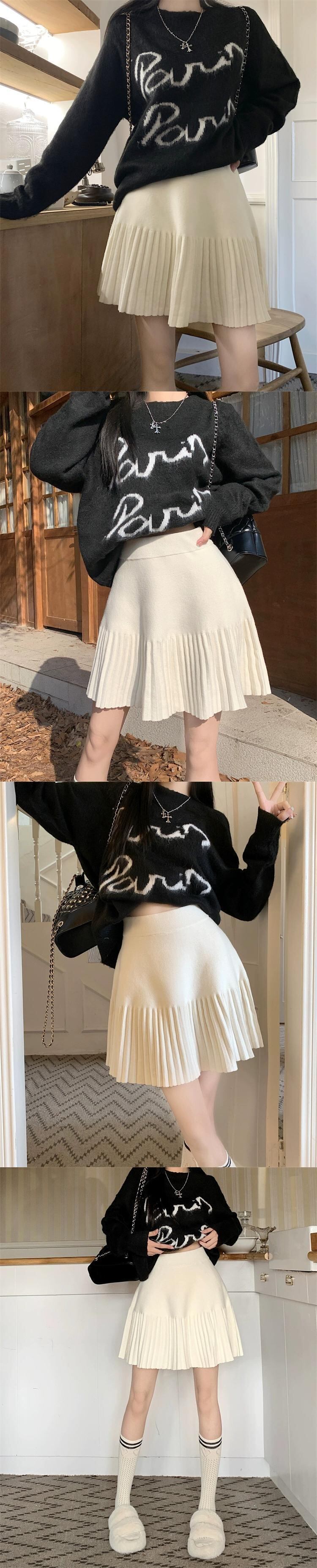 スパイス無地オールマッチニットスカート女性の春と秋 2023 新しいハイウエストルーズスリム A ラインプリーツスカート ハイウェスト スプリング 春物 オータム 秋物 Aライン ソリッドカラー 0921976089485584