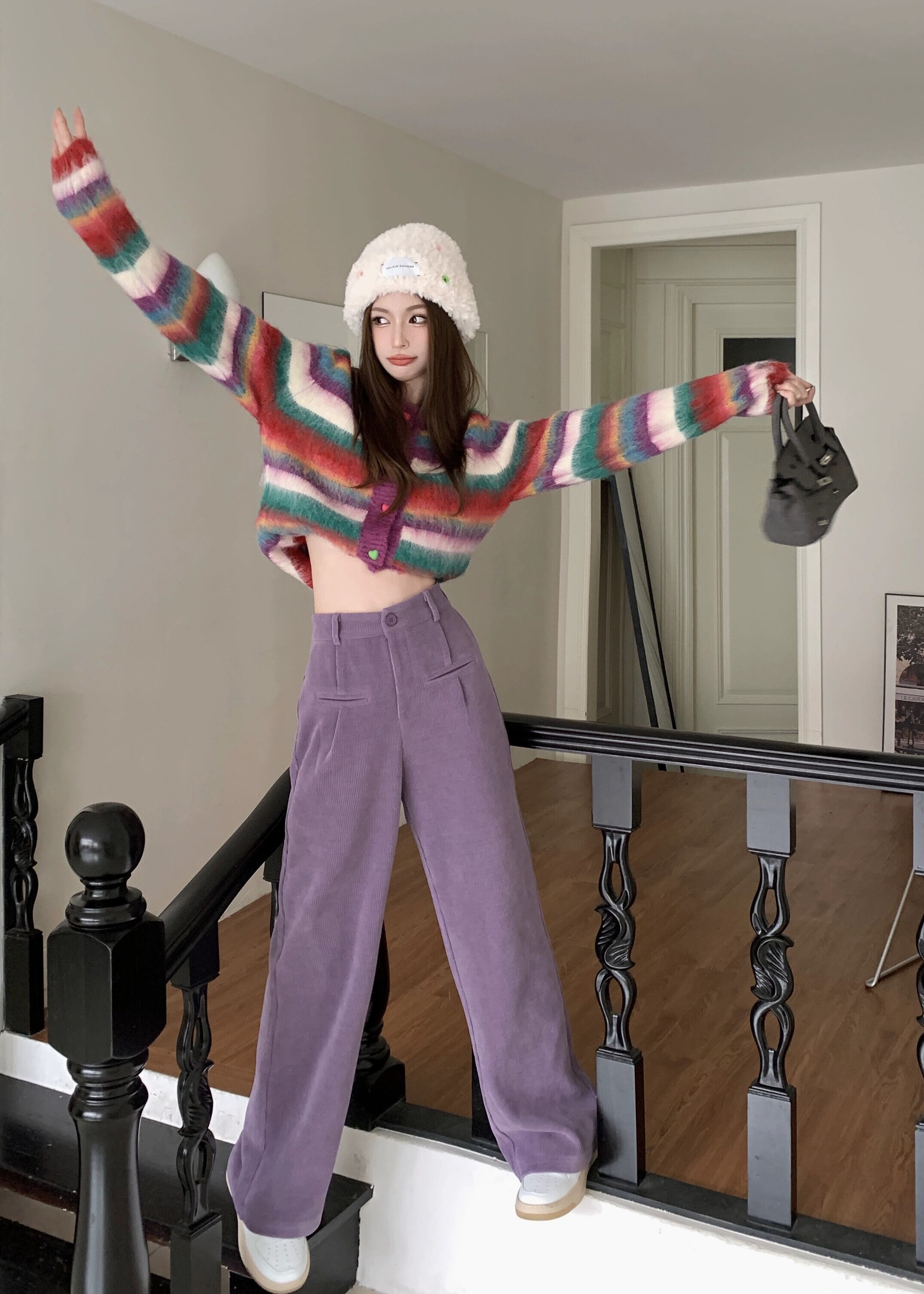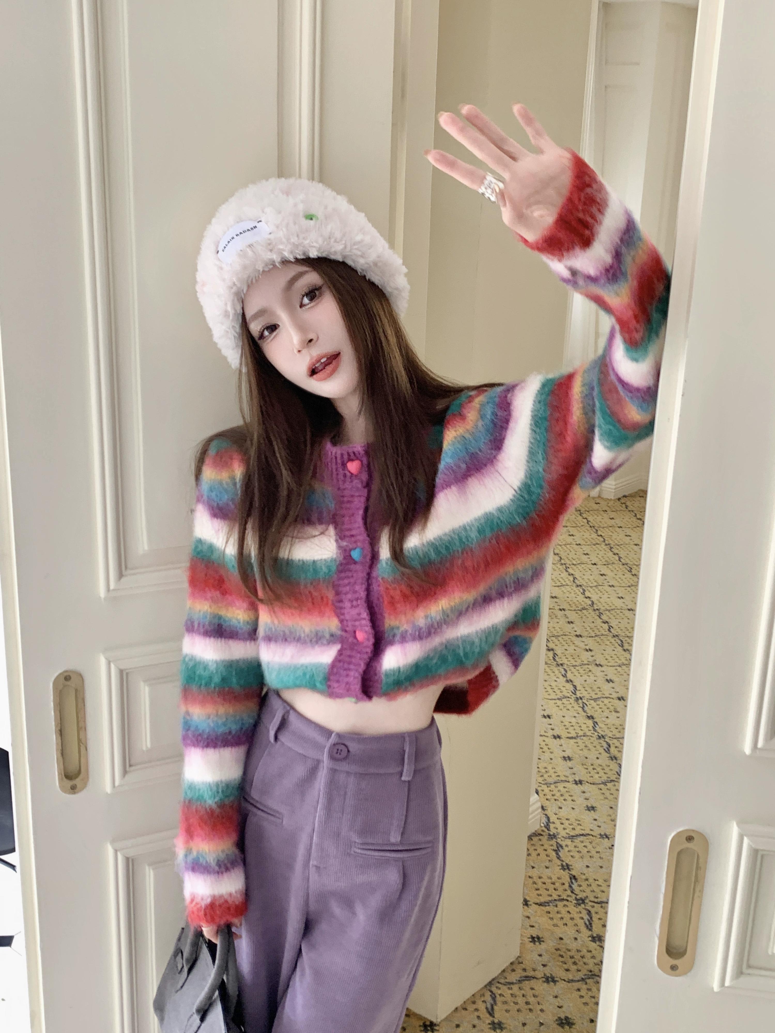 甘くてスパイシーな風レインボーストライプ長袖セーターコート女性の冬の 2023 新しいソフトワックス老化軽減ラウンドネックニットカーディガン ロング 大人ガーリー スウィート キュート カジュアル ウィンター 冬物 Oネック 0921954998159097
