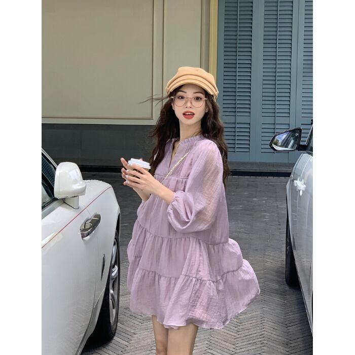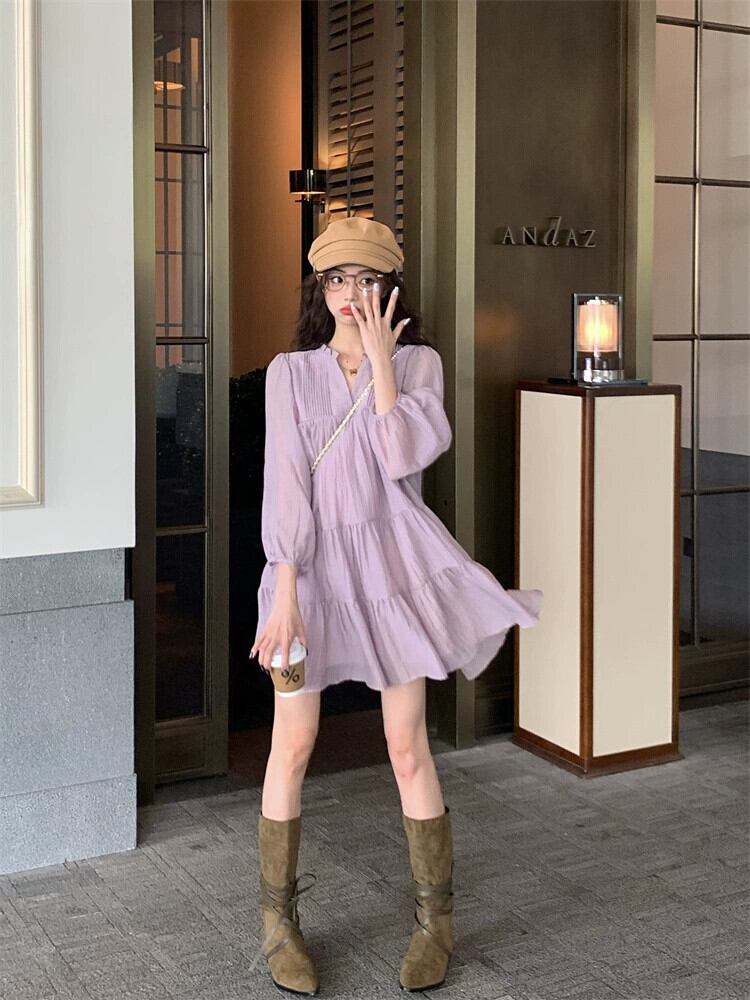 優しい風紫プリーツ V ネックドレス女性の 2023 春の新しい気質ルーズスリム妖精 A ラインスカート スプリング 春物 Vネック Aライン パープル 0921926991050312