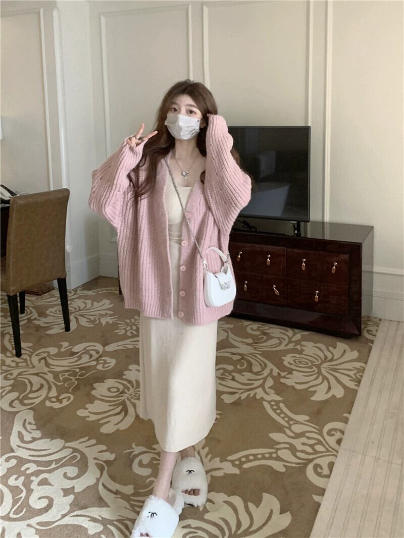 Gentle Wind ピンク V ネック セーター ジャケット 春 2023 シンプルな怠惰なルーズ ニット トップ スプリング 春物 Vネック 0921988271886502