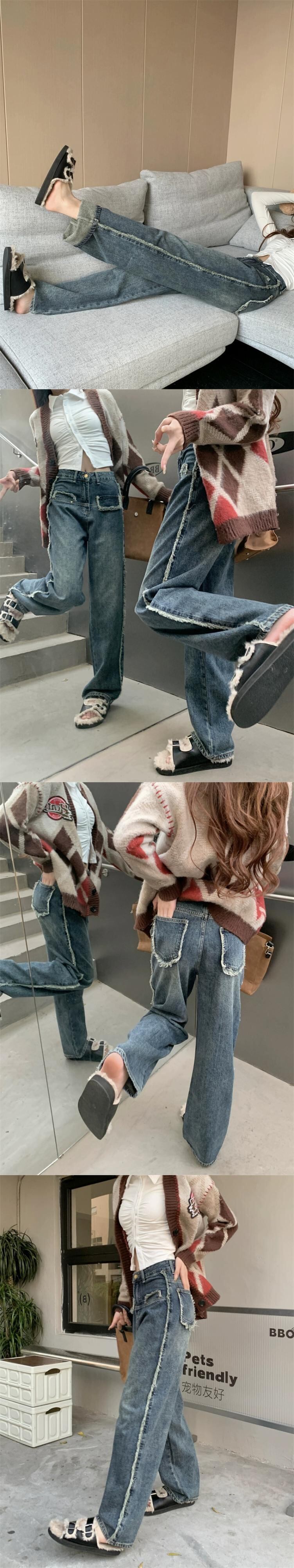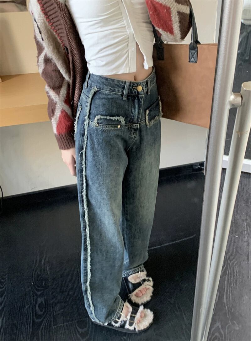 ウエストレトロコントラストカラーローエッジジーンズレディース2023春秋の新しいデザインセンスストレートルーズオールマッチモップパンツ スプリング 春物 オータム 秋物 0921959276305152