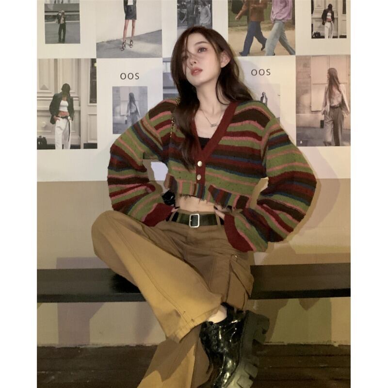 レトロヒットカラーストライプセータージャケット女性の2023春の新しいファッションオールマッチVネックニットカーディガントレンド スプリング 春物 0921943374719863