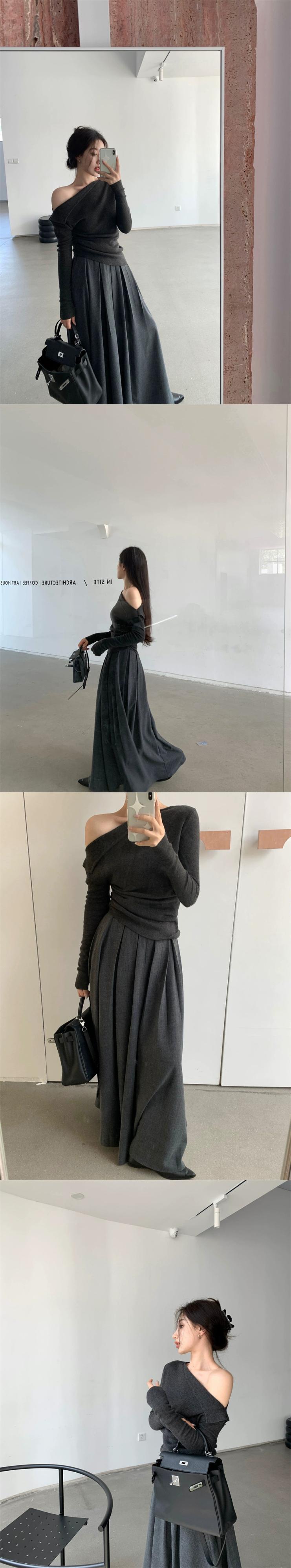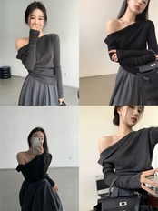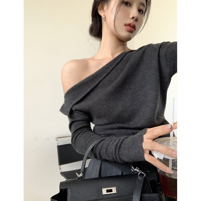 センスニッチ斜め肩長袖セーター女性の春と秋 2023 新しいレトロファッションオールマッチ底ニットトップ ロング スプリング 春物 オータム 秋物 0921967834551802