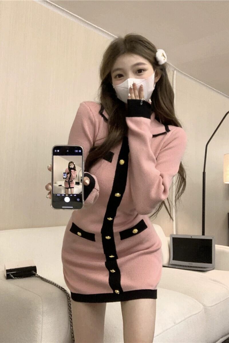 Xiaoxiangfeng ピンク長袖ニットドレス女性の春と秋の新しいショートスカート気質セレブハイエンドパッケージヒップスカート ロング スプリング 春物 オータム 秋物 0921926334061825
