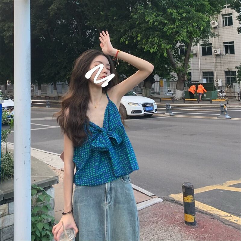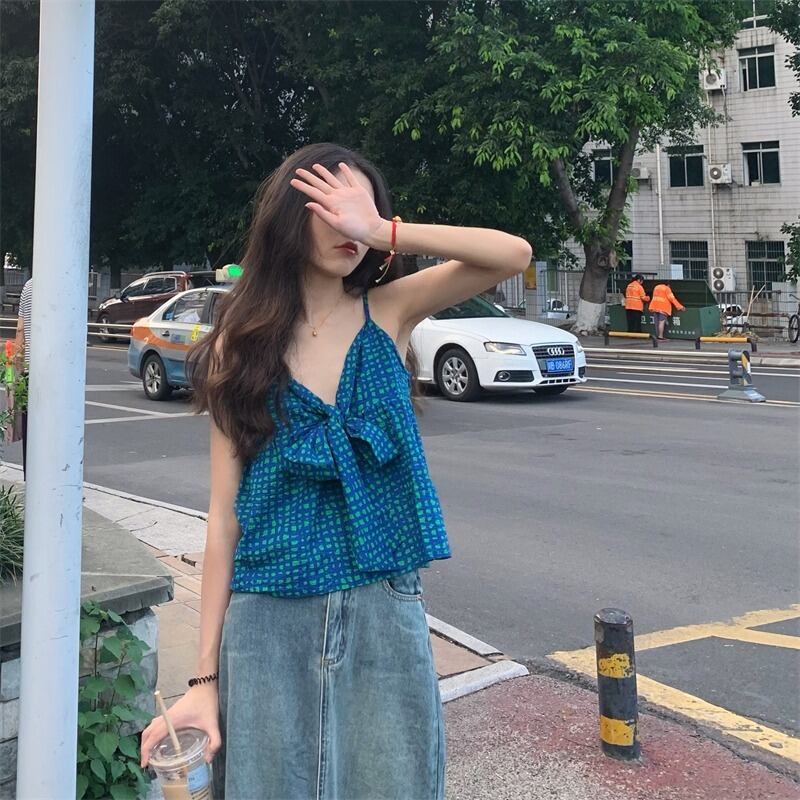 キュートで甘いちょう結びキャミソールレディース 2023 春の新しいスタイルのコントラストカラーチェック柄オールマッチノースリーブトップス リボン 大人ガーリー スウィート カジュアル スプリング 春物 0921996119165887