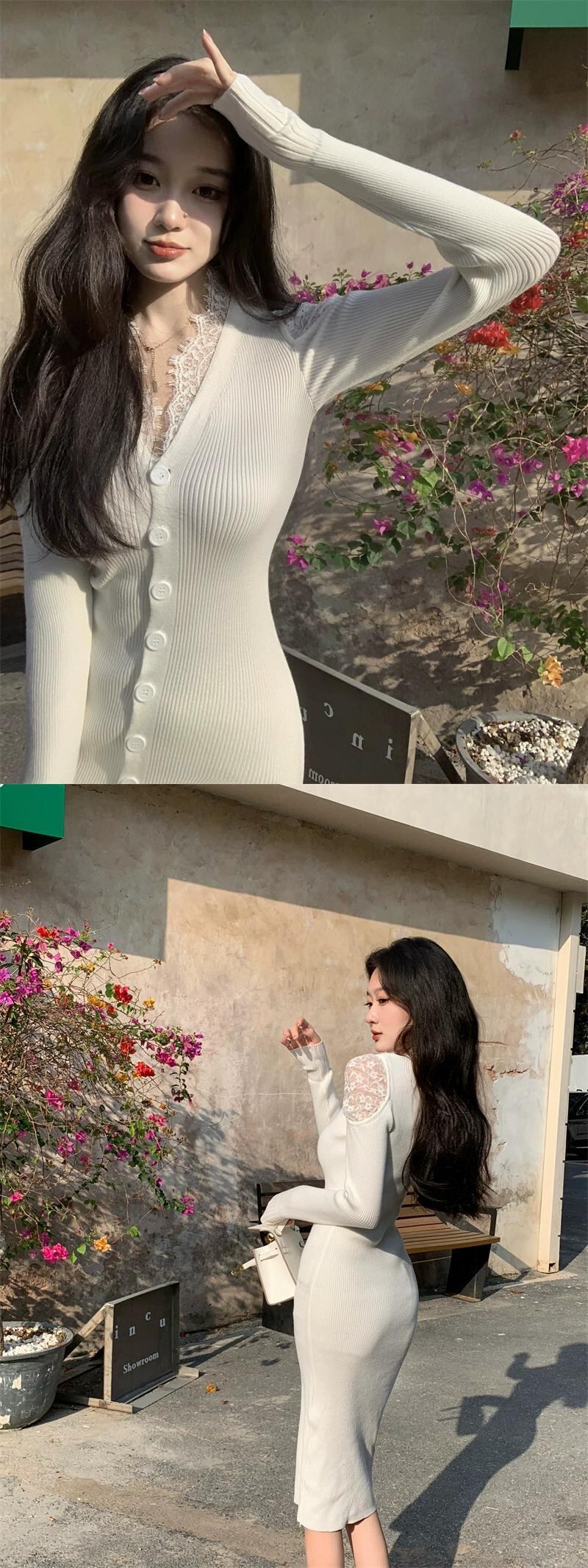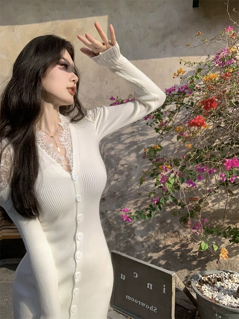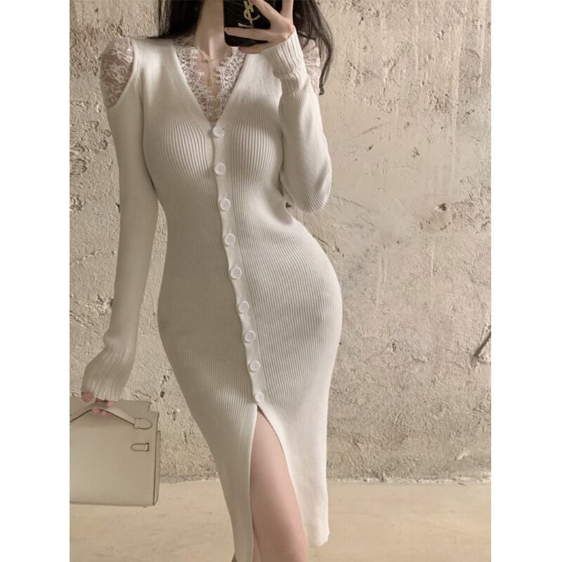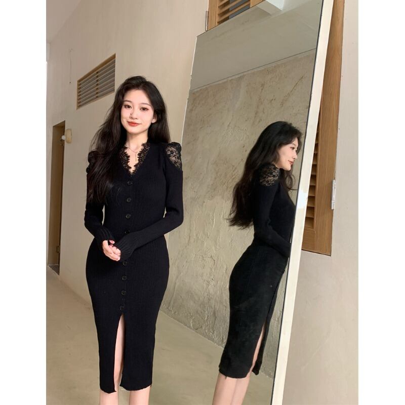 フレンチレースステッチスリット V ネック長袖ドレス女性春と秋 2023 新しいセクシーなセーターバッグヒップスカート ロング スプリング 春物 オータム 秋物 Vネック 0921992685266063