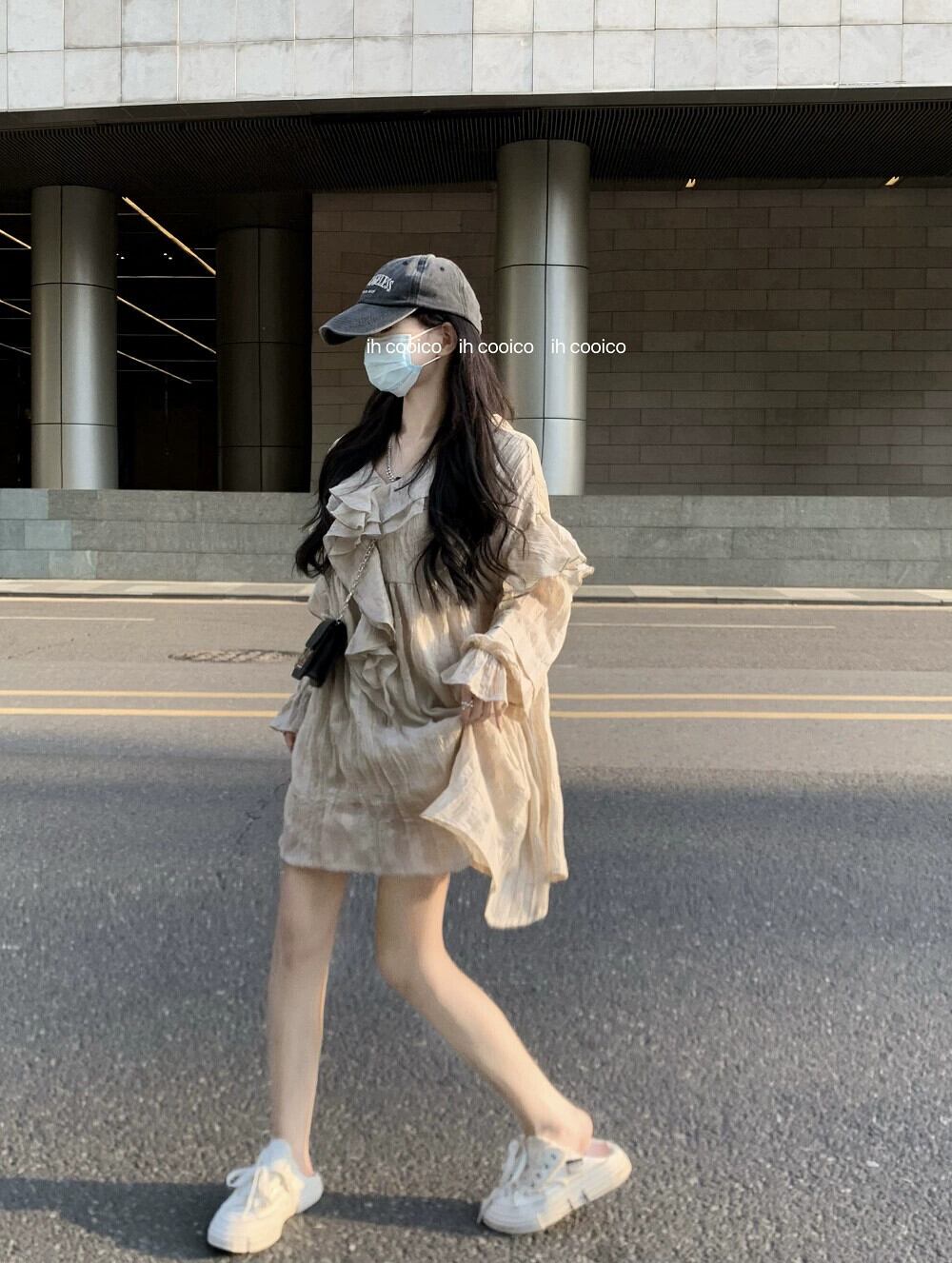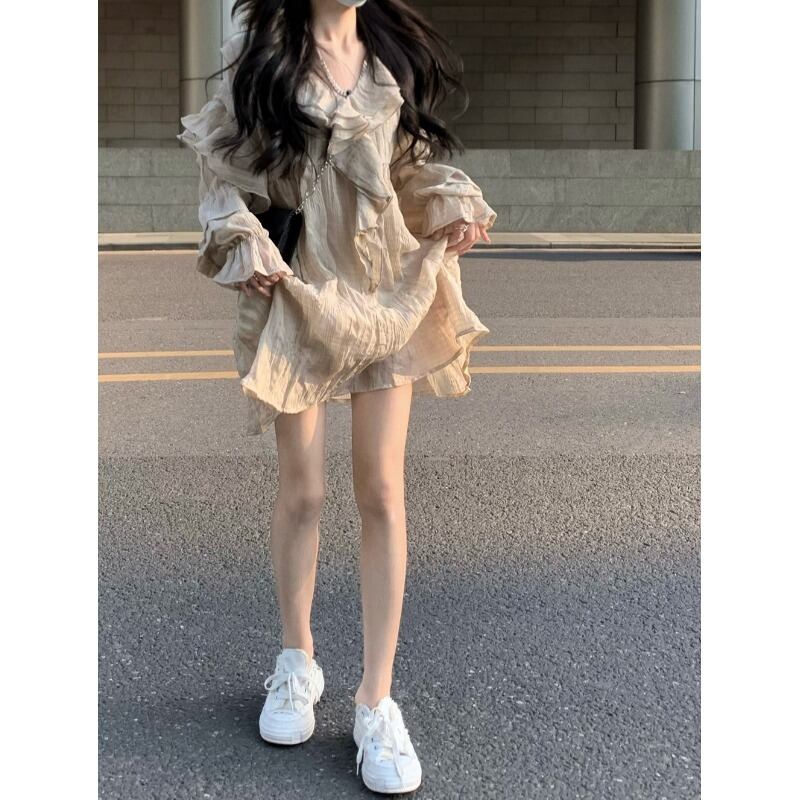 甘い V ネックデザインフリルドレス女性の 2023 春の新作スリムトランペットスリーブファーストラブドールスカート 大人ガーリー スウィート キュート カジュアル スプリング 春物 Vネック 092198216777934