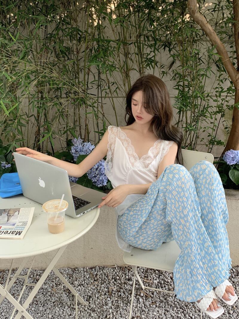 フランスの気質ファッションスーツ女性 2023 春の新作レース V ネックノースリーブトップ花柄パンツ 2 点セット スプリング 春物 Vネック 0921956286750158