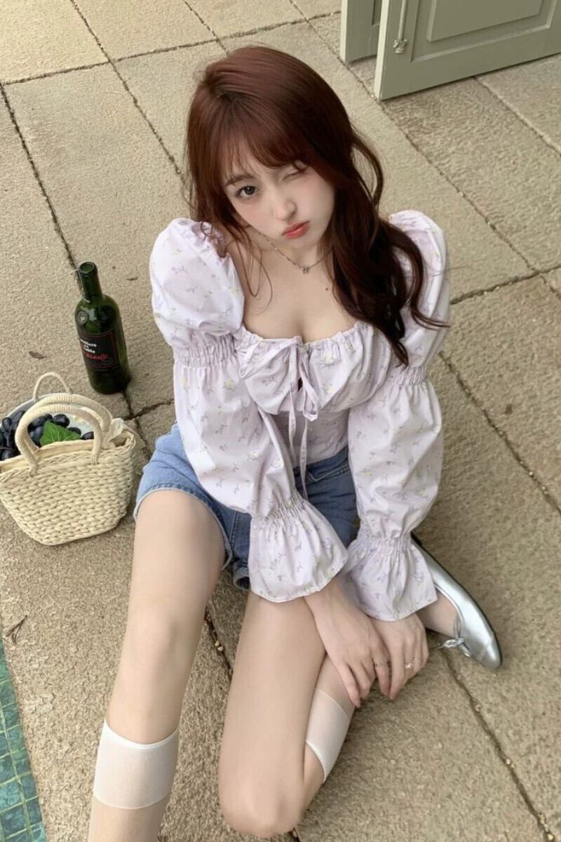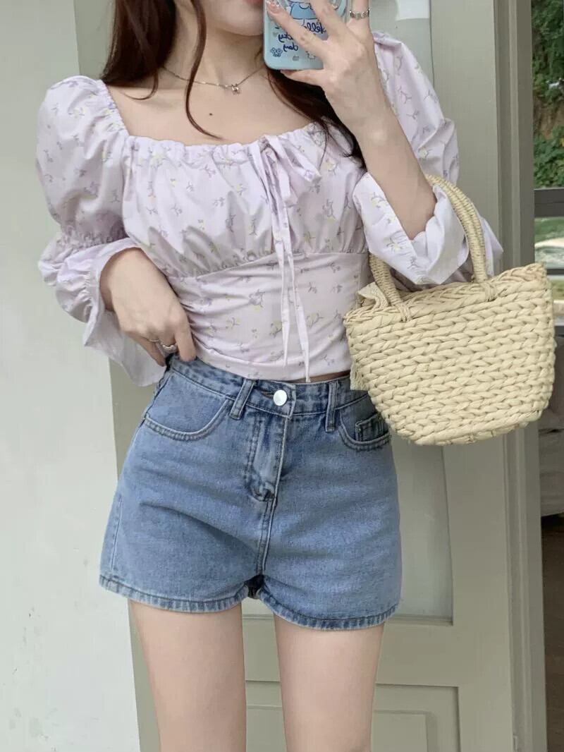 優しいイッシュスタイル紫花柄パフスリーブシャツレディース2023年夏新作ショートスリムスリムトップ サマー 夏物 パープル 092197925410683