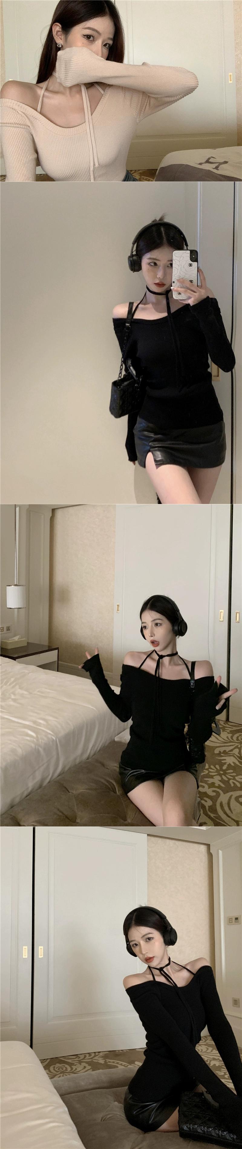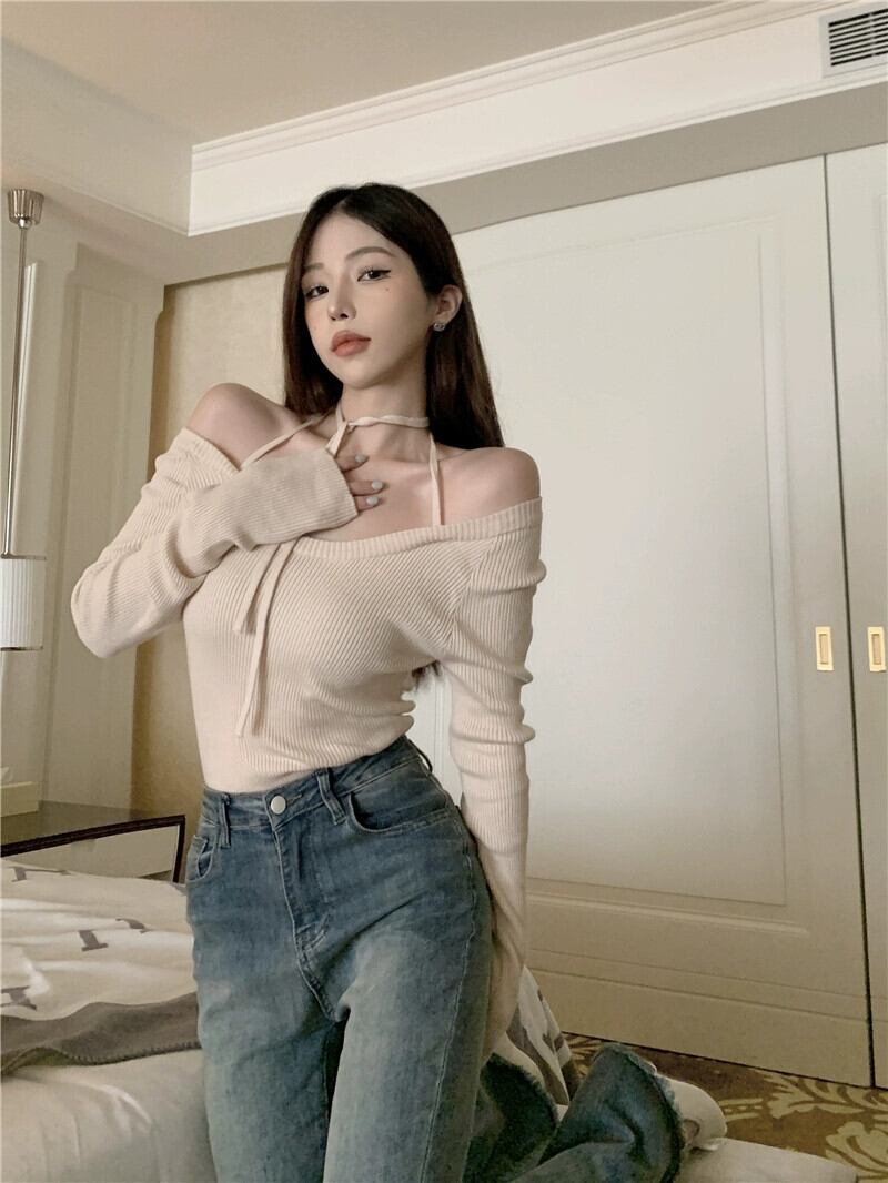 純粋な欲望スタイルの吊りネックスリムフィットニットセーター女性の 2023 春と秋の新しいデザインセンスニッチスリム長袖トップ ロング スプリング 春物 オータム 秋物 0921988788125180