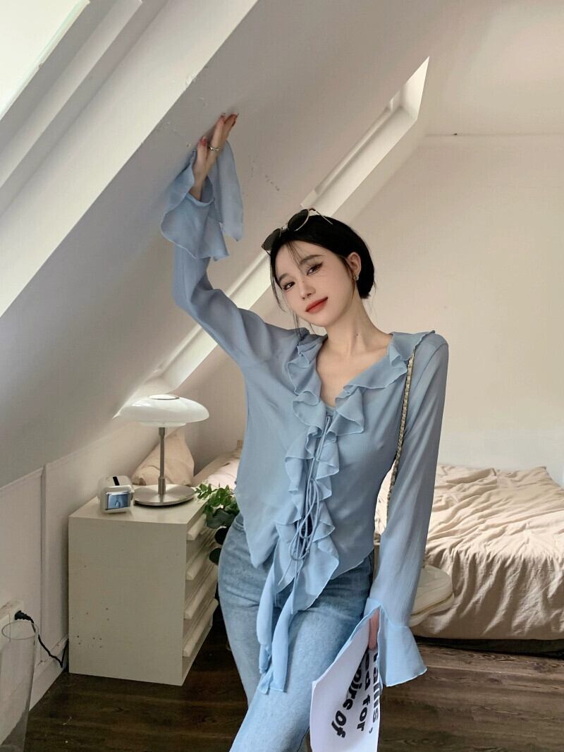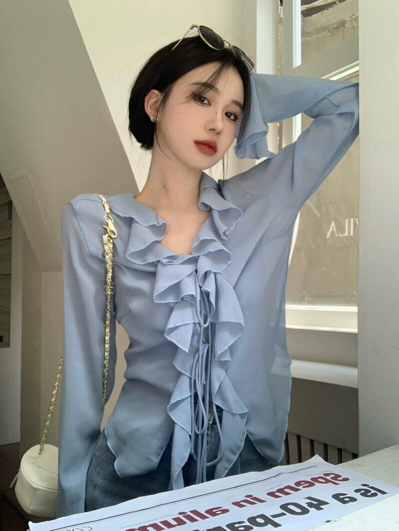ファルバラシャツレディースデザインセンスニッチシャツサマーブルーハイエンドフレンチシックで美しい長袖トップ ロング 夏物 0921938829382919