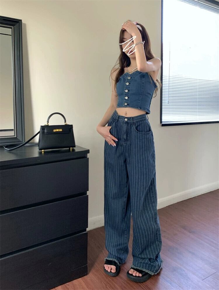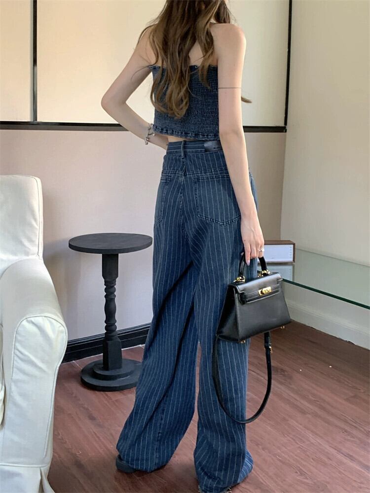 レトロファッションカラーコントラストストライプジーンズ女性の夏の2023新しいデザインセンスハイウエストルーズスリムワイドレッグパンツ ハイウェスト サマー 夏物 ワイドパンツ 0921942787602531