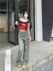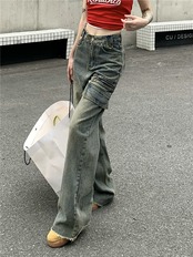 アメリカンレトロツーリングジーンズレディース2023夏新作ウォッシュルーズハイウエストストレートワイドレッグパンツズボン ハイウェスト サマー 夏物 ワイドパンツ 0921995186654206