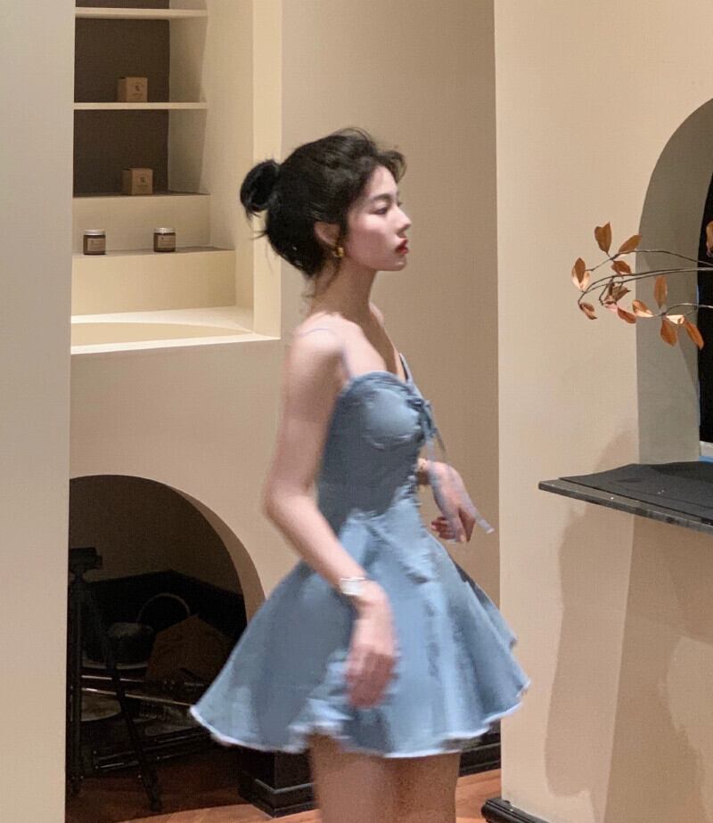 レトロデニムサスペンダードレス女性の夏の2023新しいウエスト痩身オールマッチストラップAラインスカート サマー 夏物 0921942005965536