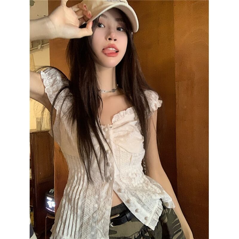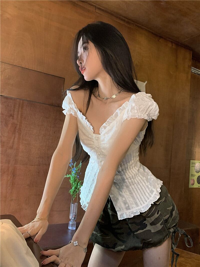 セクシーな白いレースのシャツ女性の夏の純粋な欲望デザインセンスニッチワンショルダーシャツカーディガントップ潮 ホワイト サマー 夏物 ピュア 0921998863769457
