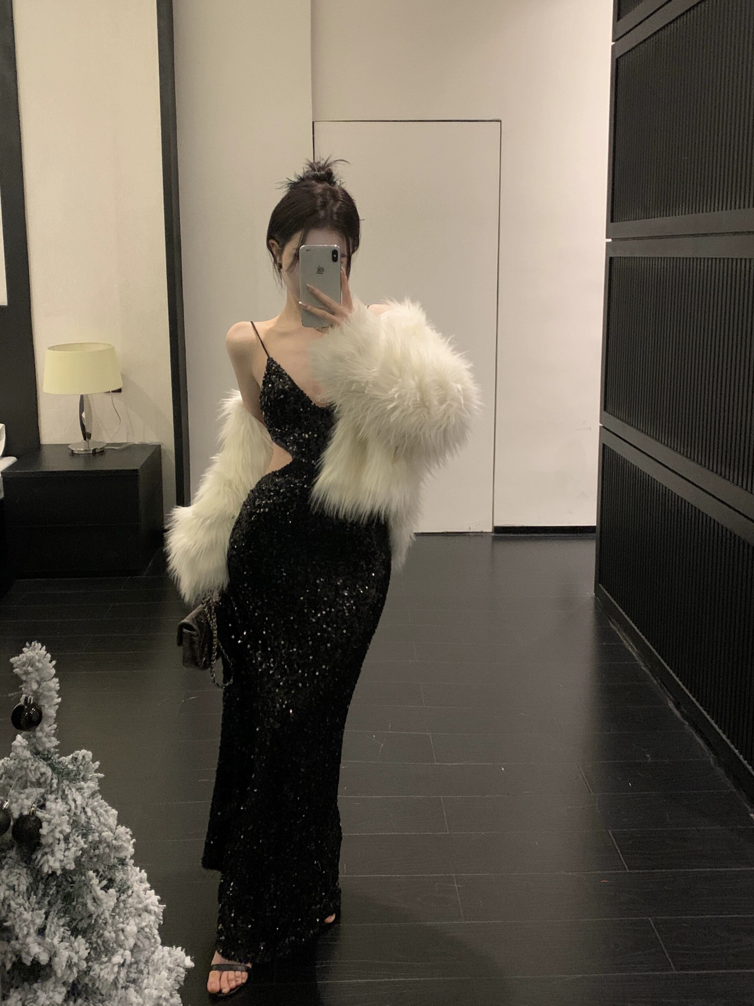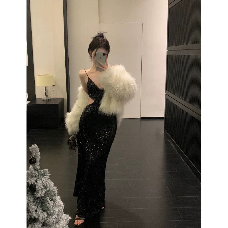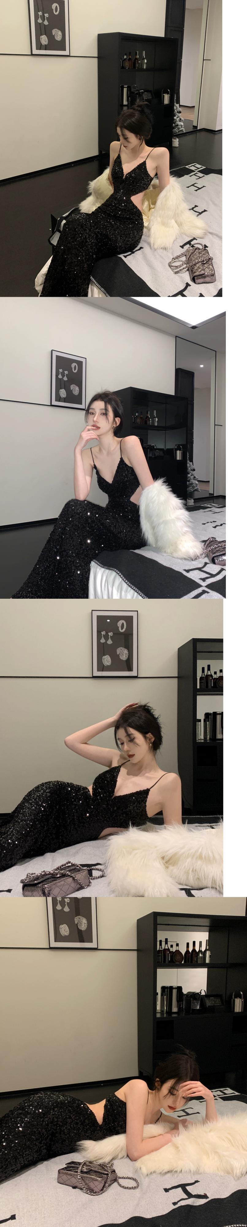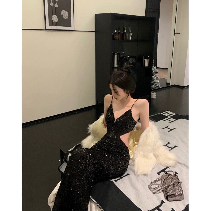 中空セクシーなスパンコール黒サスペンダードレス女性の夏の 2023 新しいスリムスリムボトムロングスカートトレンディな ブラック サマー 夏物 0921995963828768