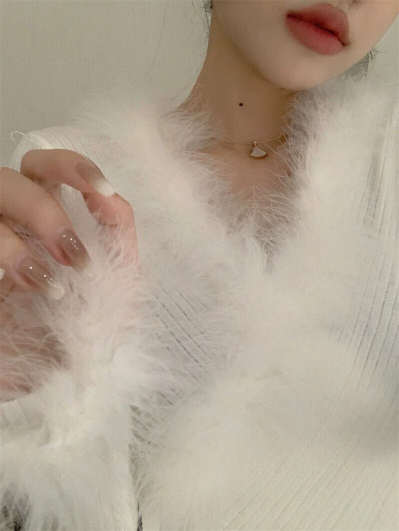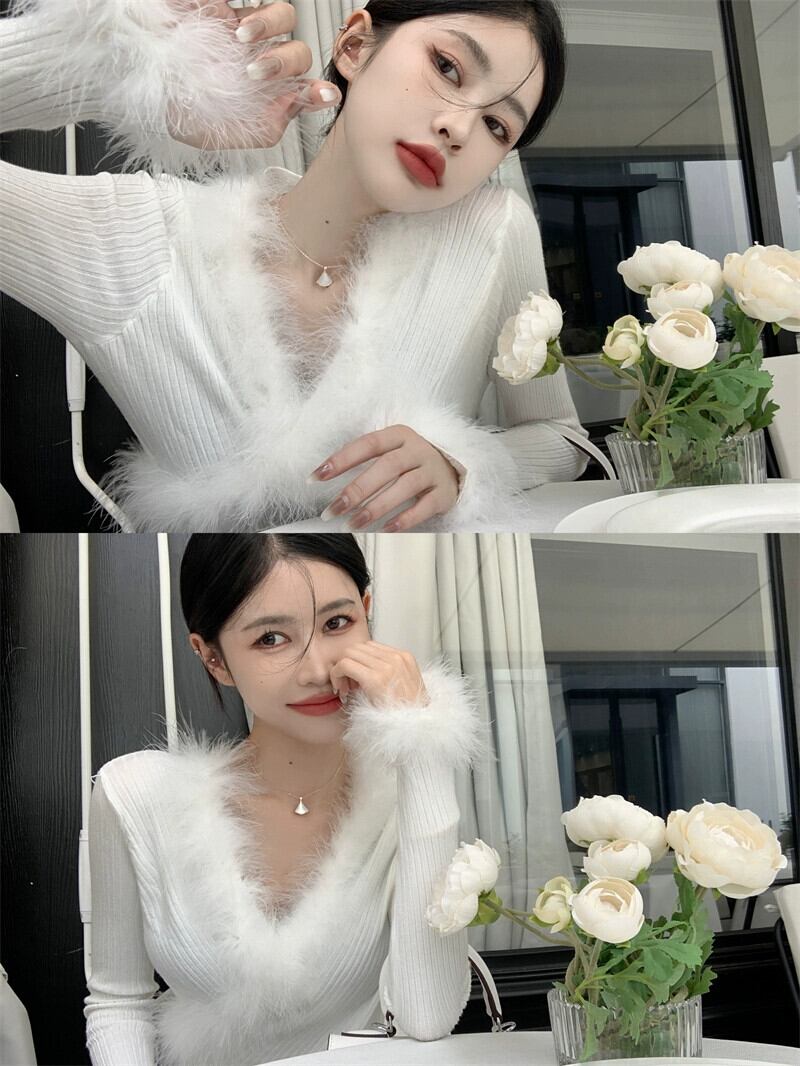 有能ニッチ スプライシング毛皮のような長袖ニット セーター レディース 2023 春の新作クロス V ネック スリム フィット トップ ロング スプリング 春物 Vネック 0921922869692276