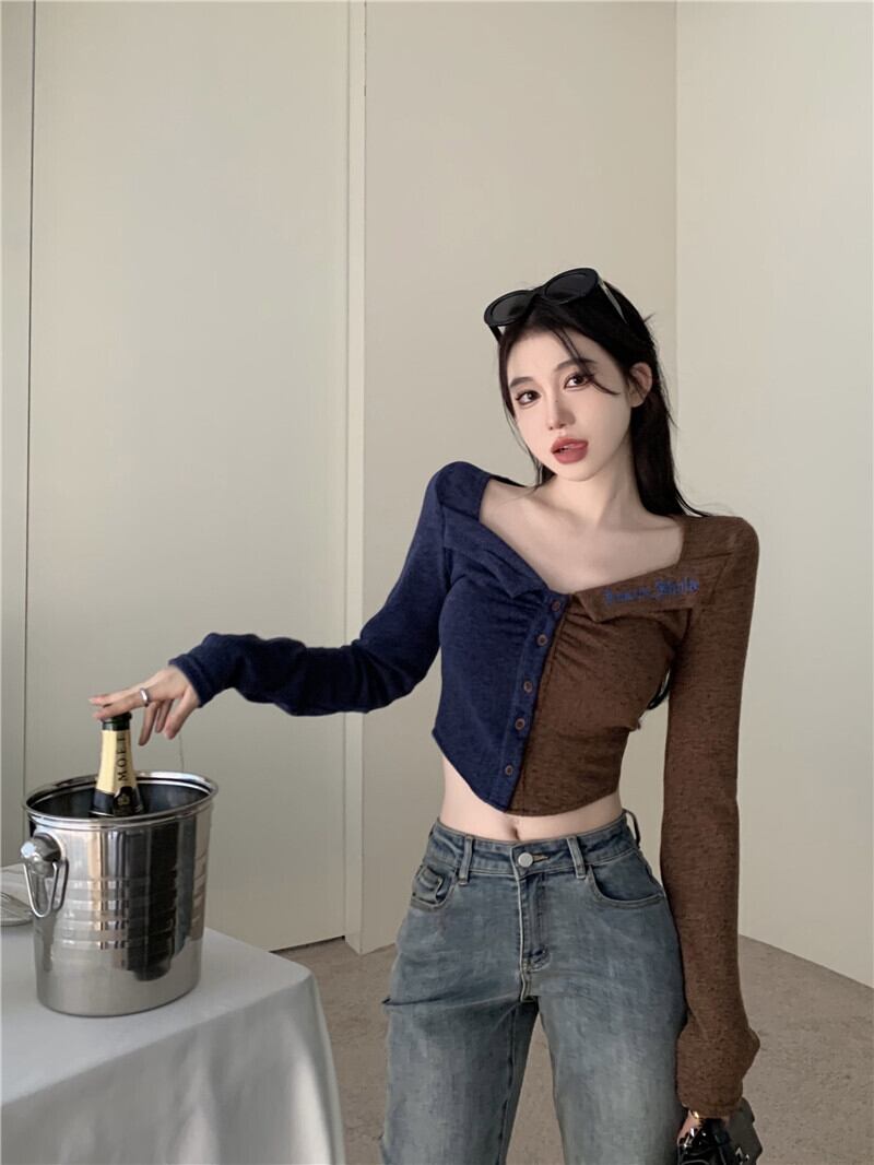 トレンドカラーコントラスト刺繍長袖Tシャツレディース2023春新作デザインセンスニッチスリムスリムトップス ロング スプリング 春物 0921927871947725