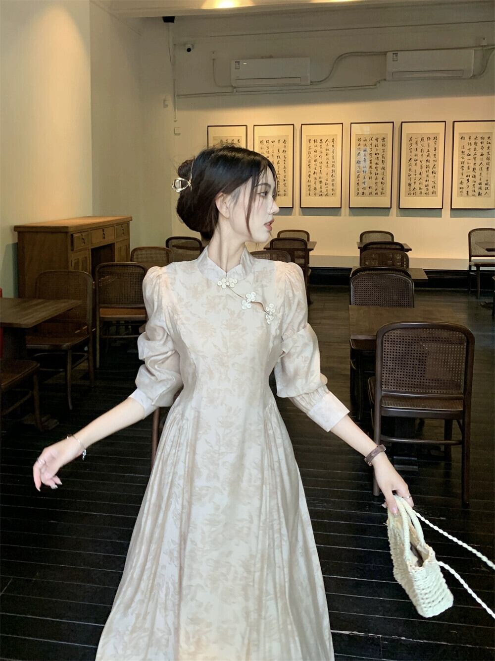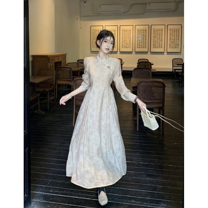 レトロな新中国風の国民風長袖ドレス女性の春の気質立ち襟改良されたチャイナドレスバックルミドル丈スカート ロング スプリング 春物 0921997860484444