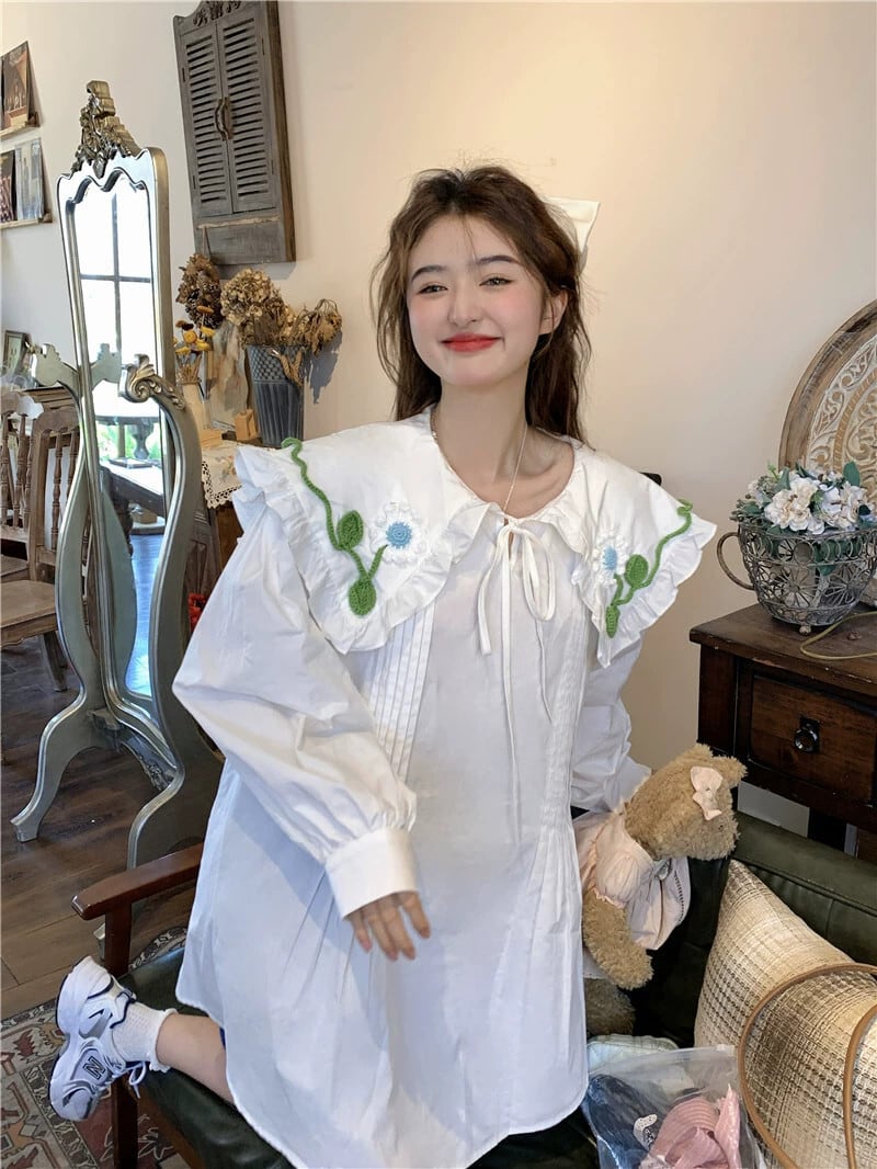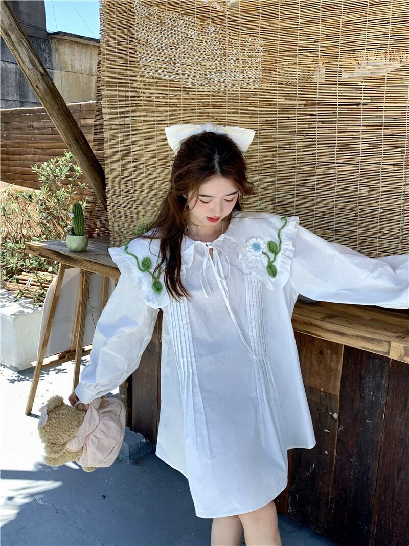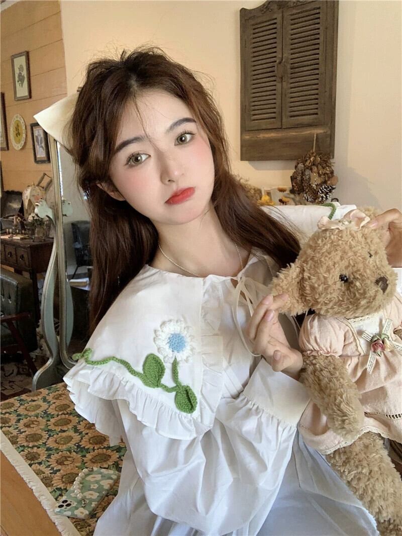スタイル甘い蓮の葉エッジ大きなラペルシャツ女性の夏の重工業立体フラワーシャツルーズ長袖トップ ロング 大人ガーリー スウィート キュート カジュアル サマー 夏物 フラワーデザイン 092197398969418