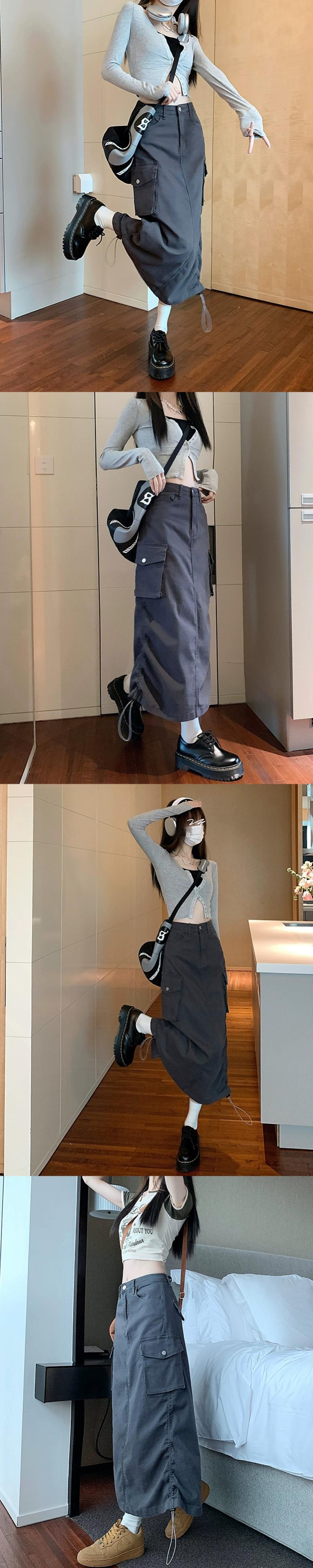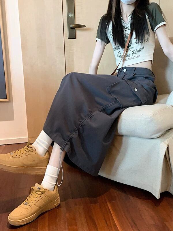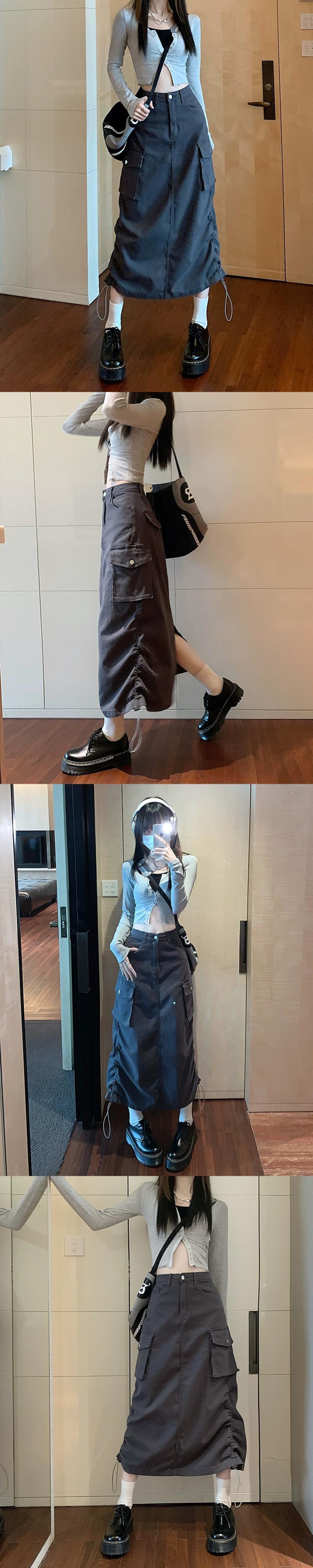 レトロツーリングデザインデニムスカート女性 2023 春の新作巾着ハイウエストミッドレングスストレートスカート ハイウェスト スプリング 春物 0921975448998703
