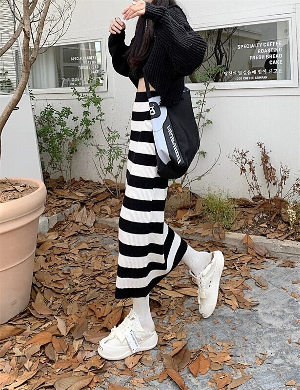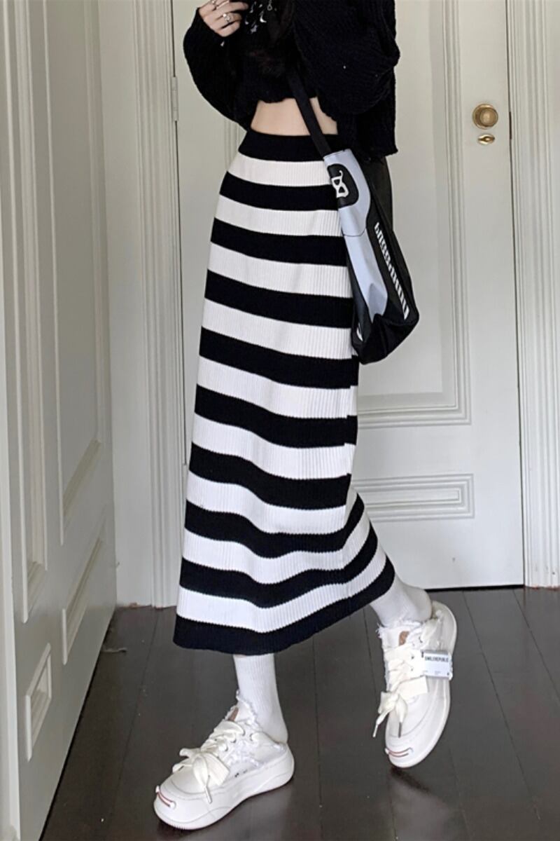 センスニッチハイウエスト薄いストライプスカートレディース2023年初春新作オールマッチウールミドル丈スカートトレンディ ハイウェスト スプリング 春物 0921965060173613