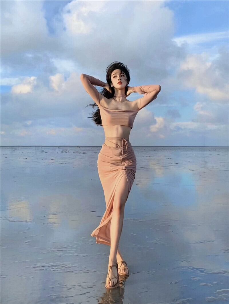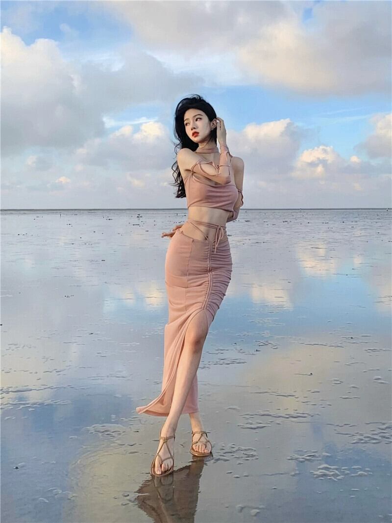 Pure Desire スパイスガールズ ホルターネック 中空チューブ トップスーツ フェミニン 包帯 ミドルロング スリットスカート 2点セット 0921990933284058