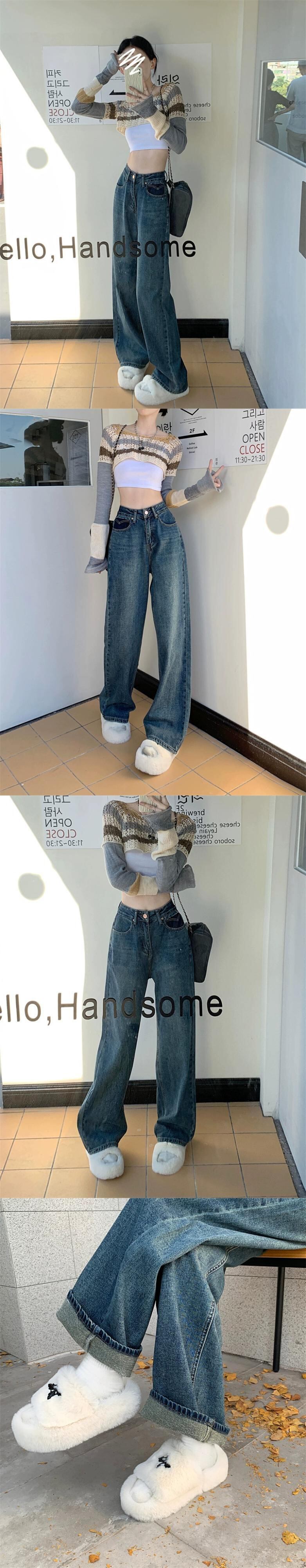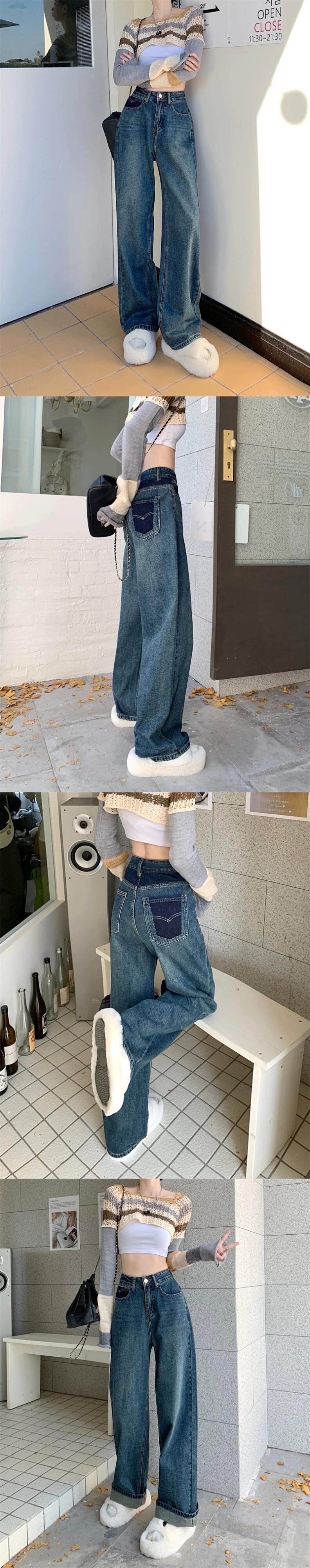 レトロルーズ薄いデニムジーンズレディース早春2023ポケットコントラストカラーウエストワイドレッグパンツ スプリング 春物 0921996075574226