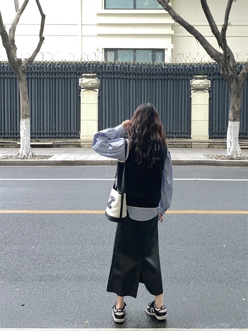 色:ひし形のベスト,青いシャツ,黒のスリットレザースカート