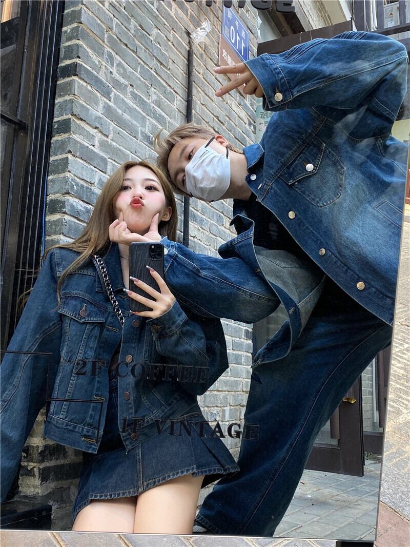 香港風デニムスーツスカートレディース春レトロルーズショートコートプリーツAラインスカート2点セット スプリング 春物 0921998021390701