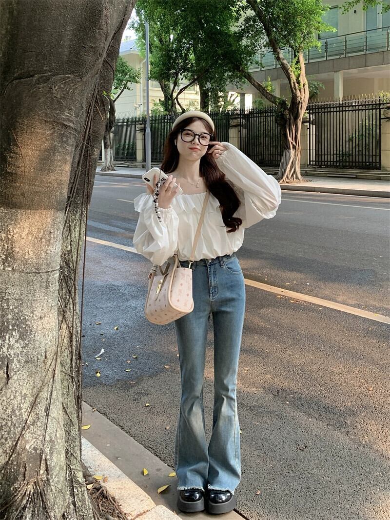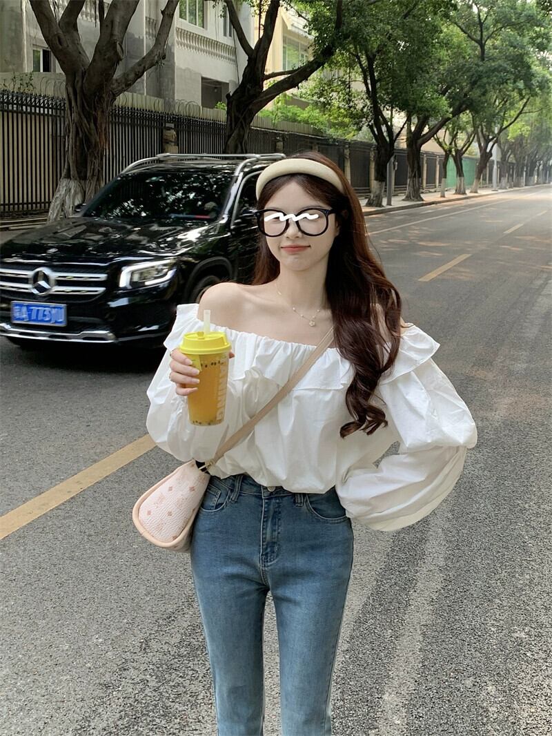 甘いレースステッチ一言襟フリル長袖シャツ女性の夏の 2023 新しいショートルーズシャツトレンド ロング 大人ガーリー スウィート キュート カジュアル サマー 夏物 0921947161273153