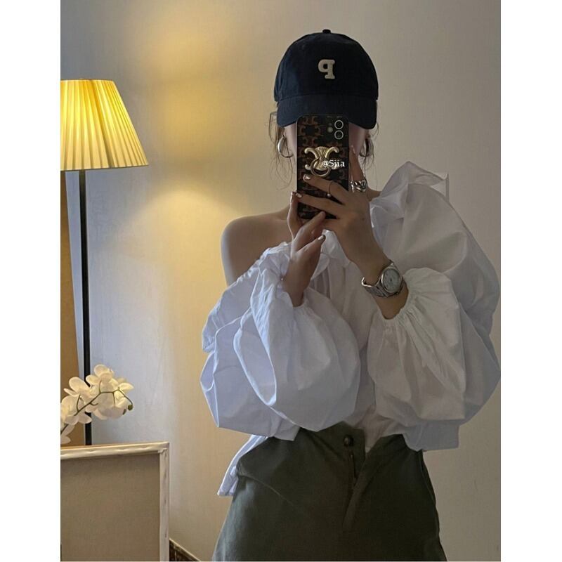フレンチ斜めショルダー白パフスリーブシャツ女性の夏の 2023 新しいセクシーなストラップレス気質ルーズシャツトップ ホワイト サマー 夏物 0921964724413151