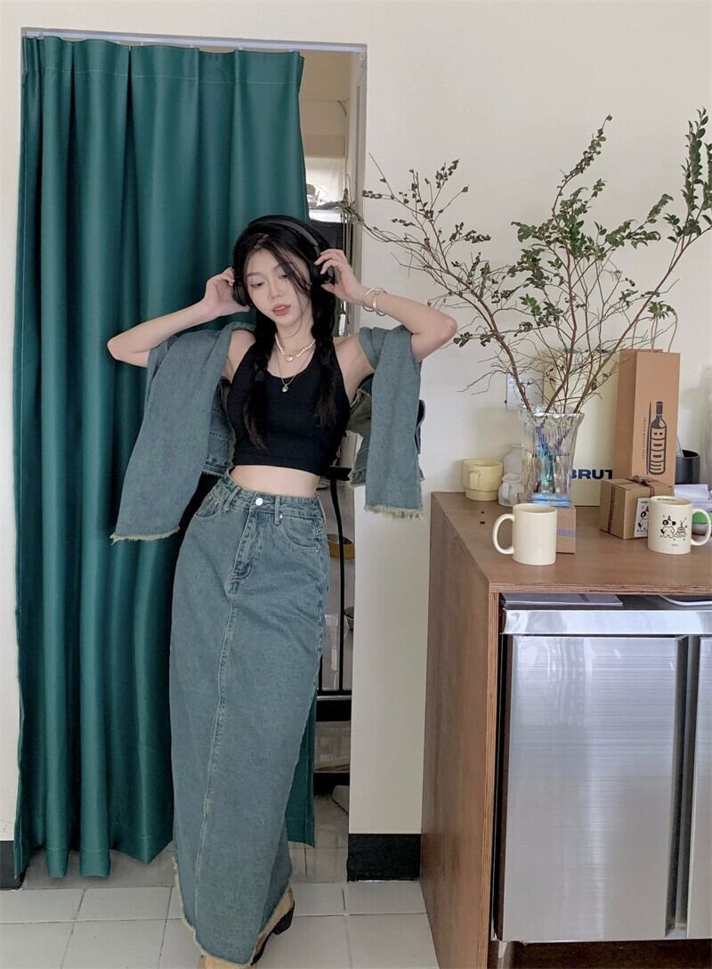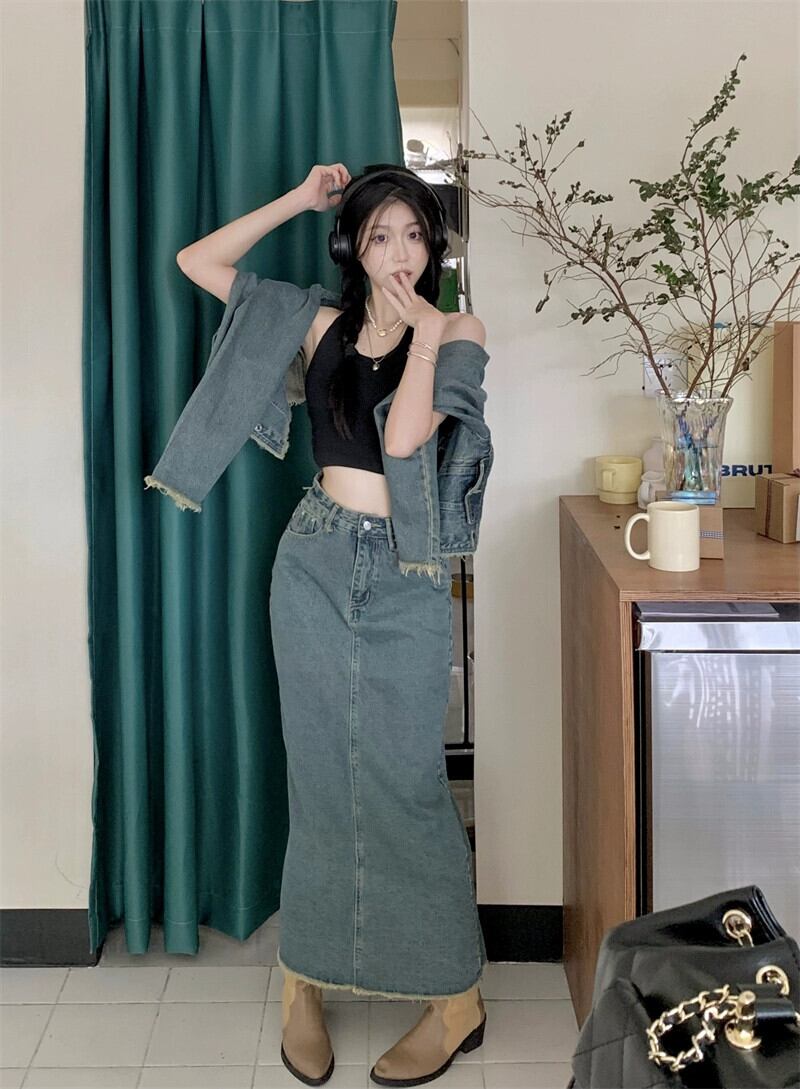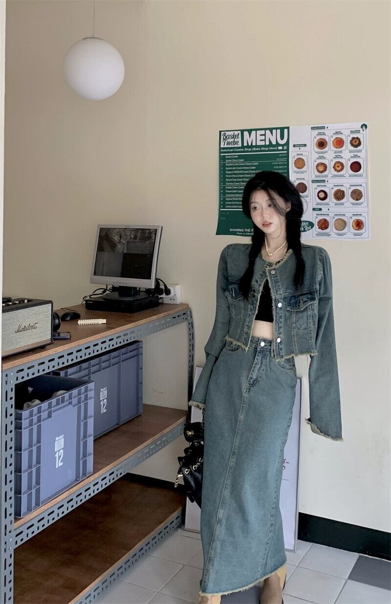 香港風センススーツ春秋気質ローエッジデニムジャケットヒップスカート2点セット スプリング 春物 オータム 秋物 0921935781676808