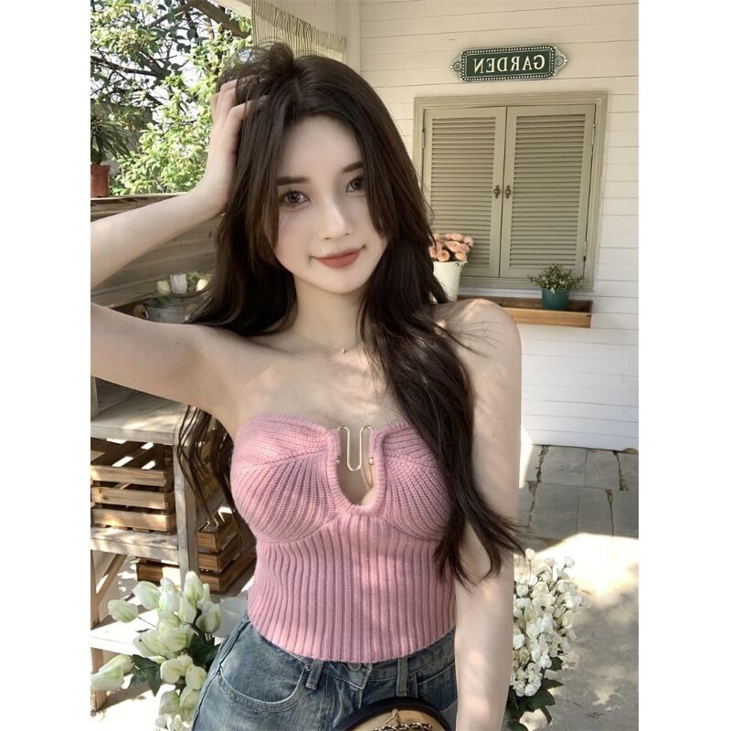 ホットスタイルピンクショートニットチューブトップ女性の夏 2023 新しいセクシーな痩身薄い底シャツトップ潮 サマー 夏物 0921956168722730