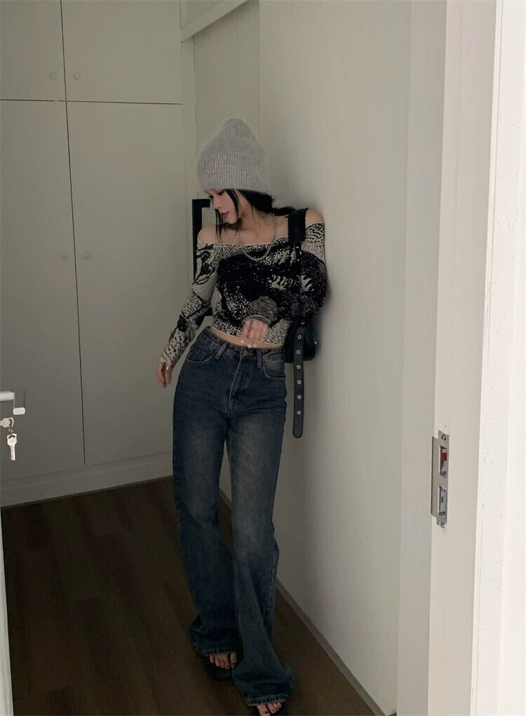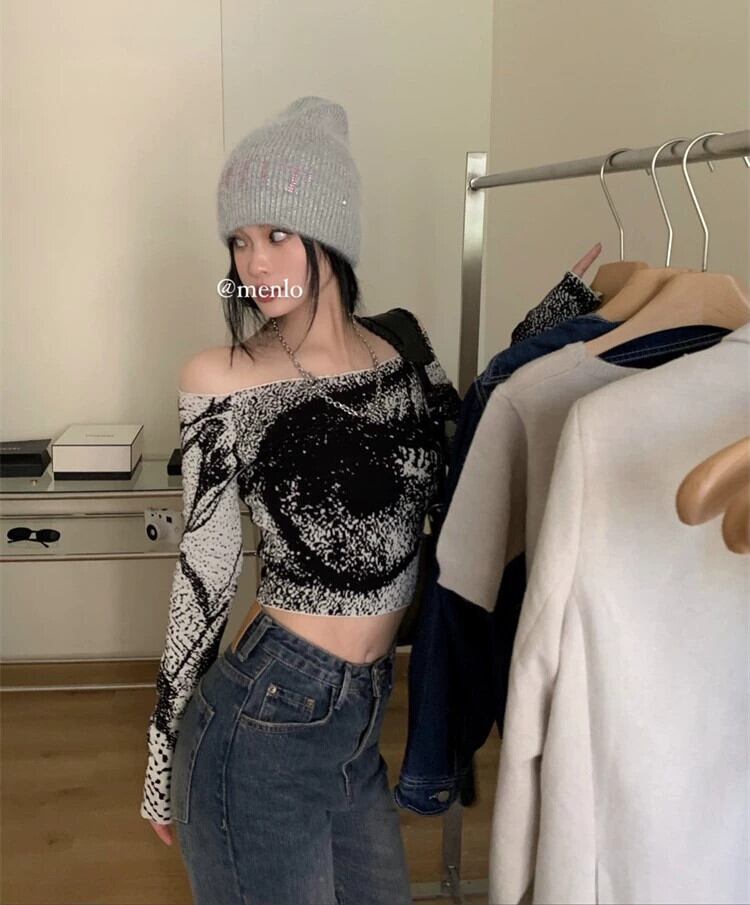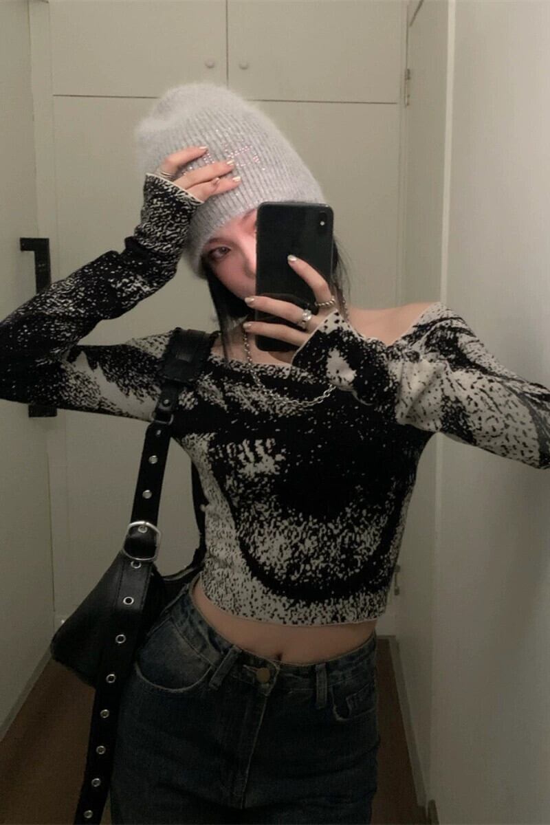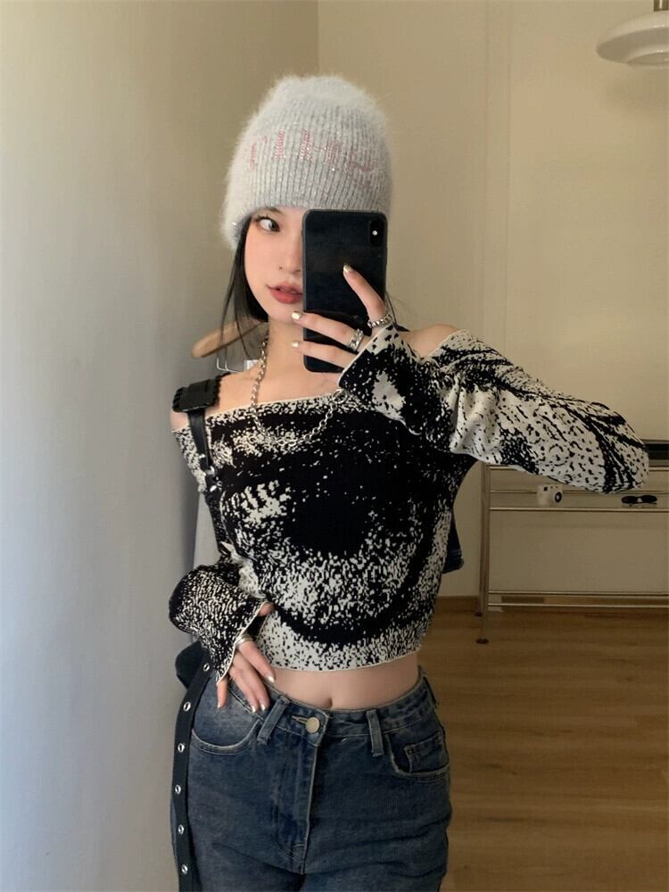 Insファッショナブルな長袖ニットセーターレディース2023春秋新しいデザインセンスオールマッチスリムワンショルダートップ ロング スプリング 春物 オータム 秋物 0921995149966767
