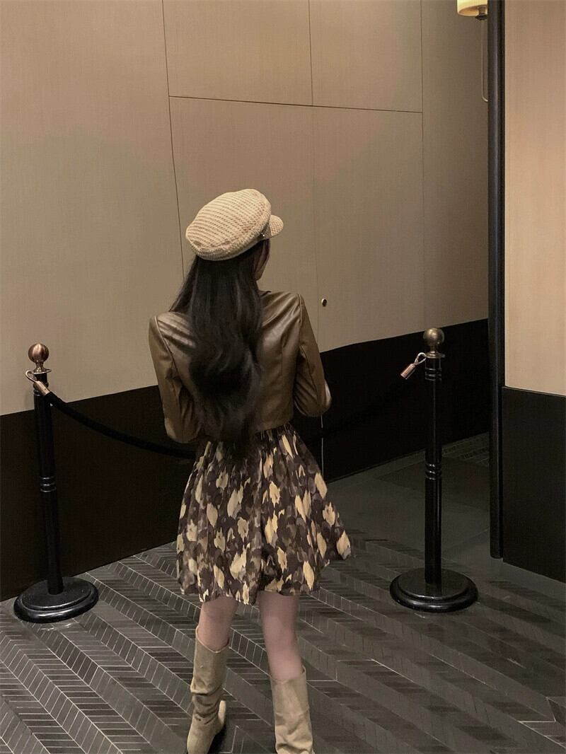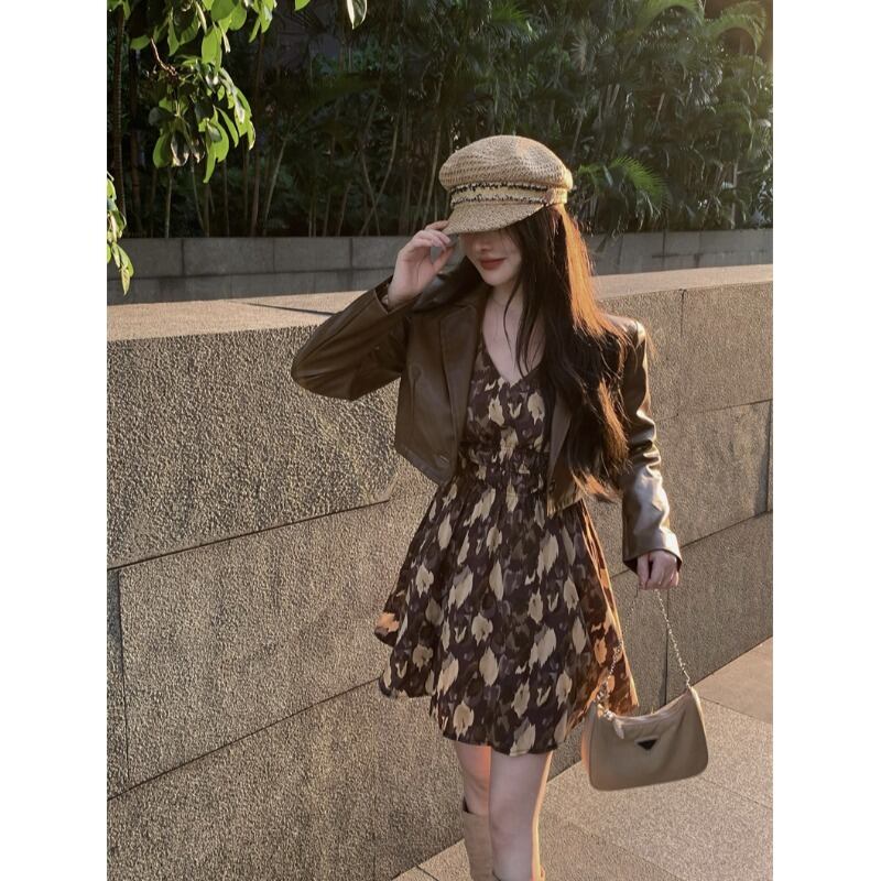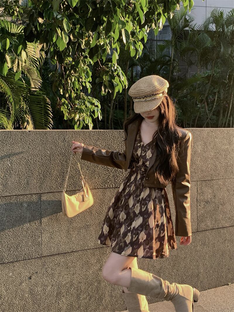 甘いクールなファッションスーツ女性の夏の 2023 新しい花柄ドレスショートスカートコーヒー色のレザージャケット 2 点セット 大人ガーリー スウィート キュート カジュアル サマー 夏物 0921929735198234
