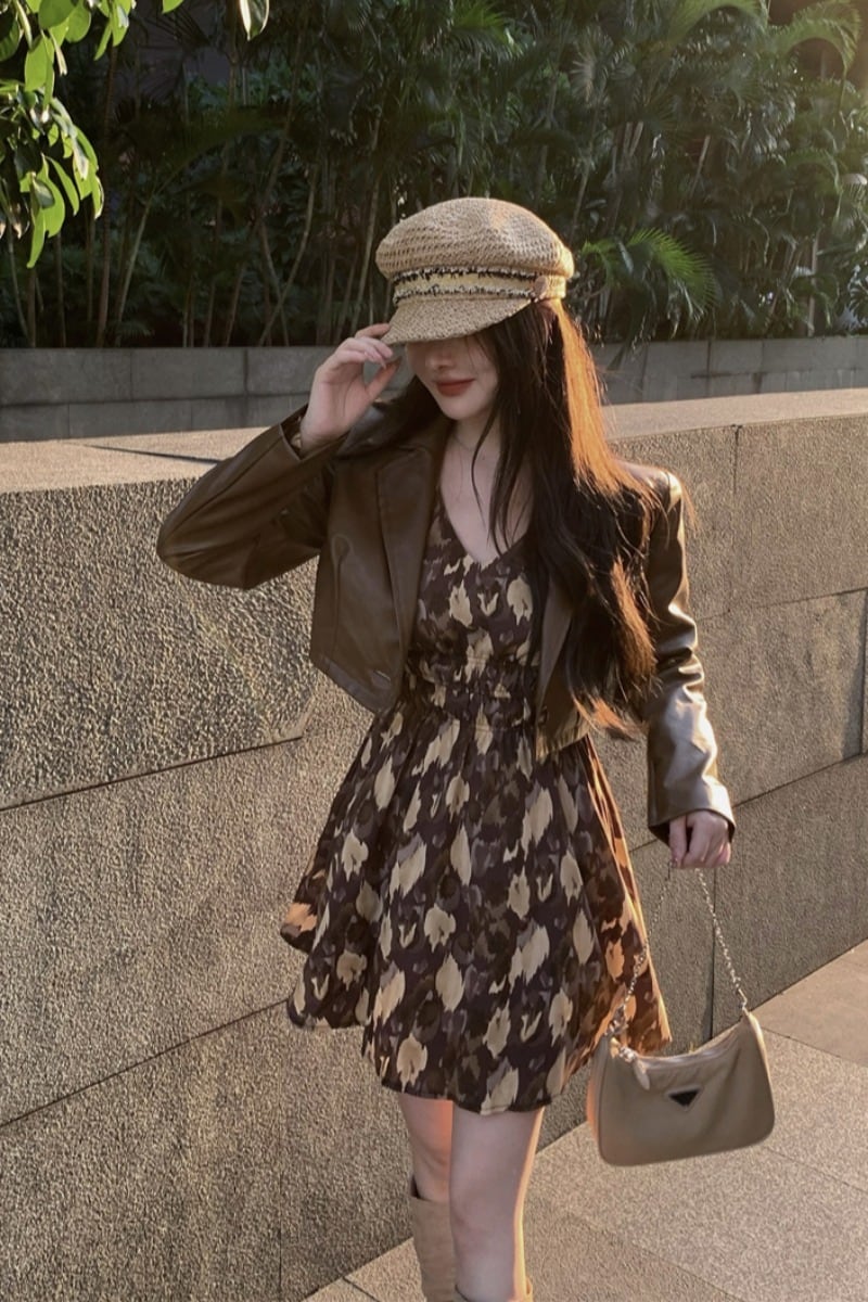 色:花柄ドレス,革の服
