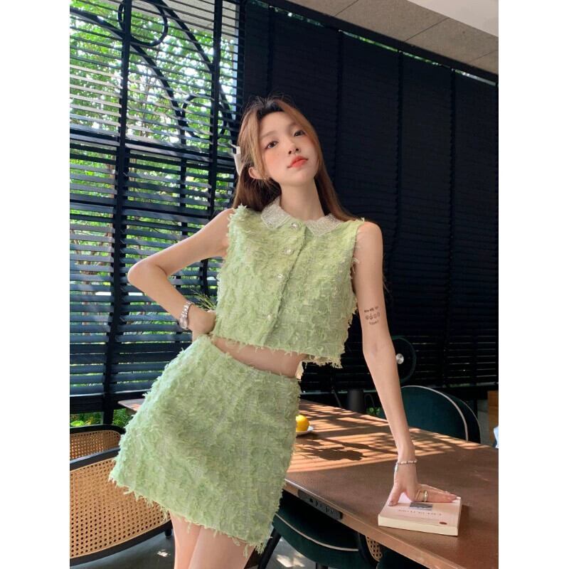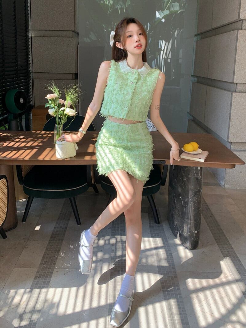 重工業グリーン小さな香りの風のスーツスカート女性の夏 2023 新しい甘いノースリーブトップスカートスカート 2 点セット 大人ガーリー スウィート キュート カジュアル サマー 夏物 0921981871536588