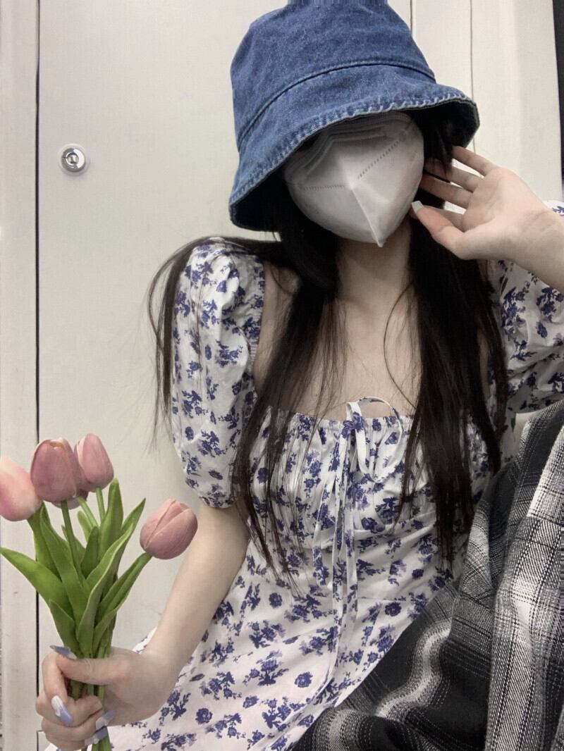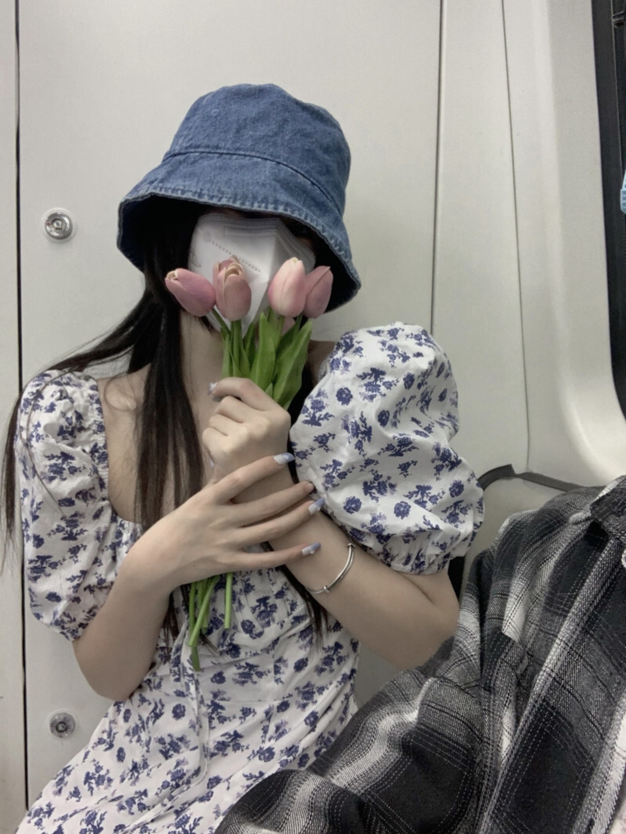 ロマンチックなスタイルの花柄スクエアカラーパフスリーブドレス女性の夏の 2023 新しいミッドレングスウエストスリットスカート サマー 夏物 スクウェア 092198564764067