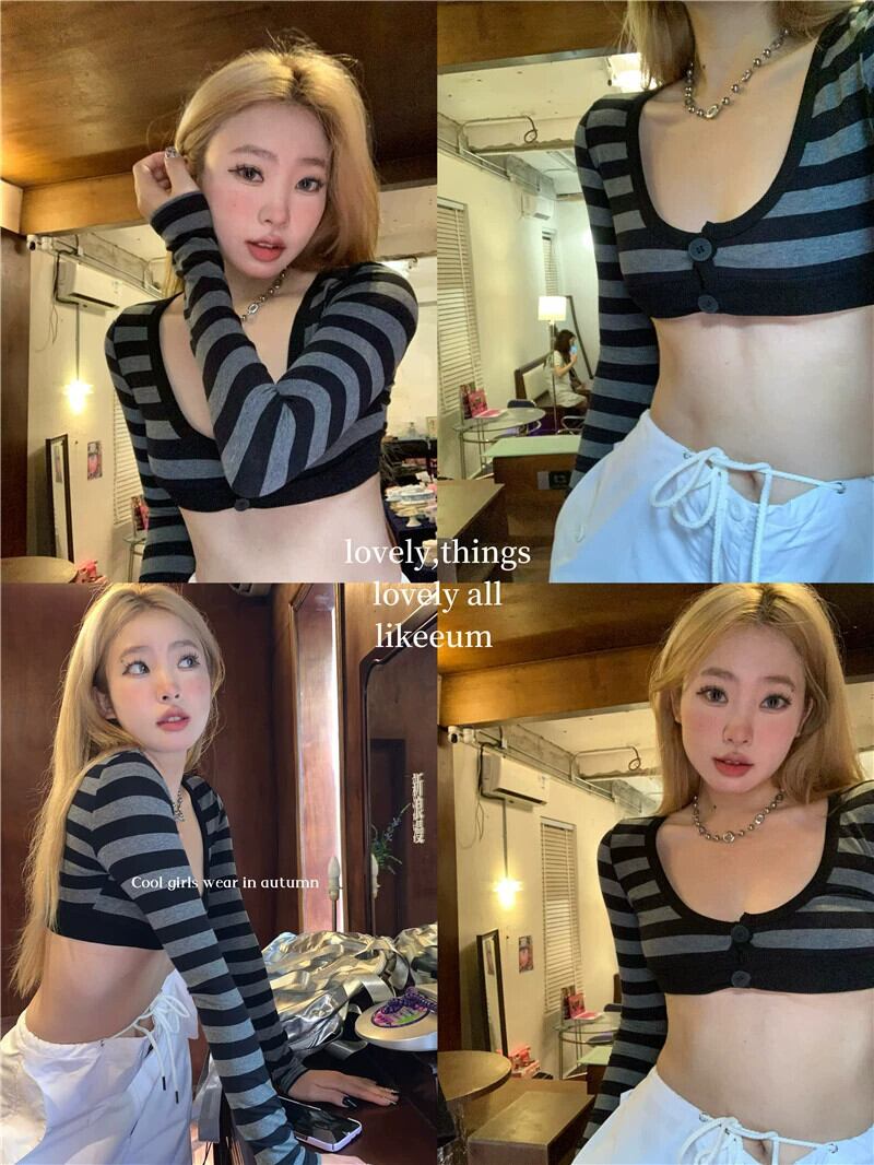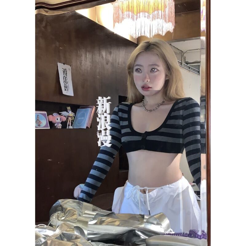 アメリカンレトロストライプ長袖 tシャツ女性の春純粋な欲望セクシーなへそハイウエストショートボトシャツトップ ハイウェスト ロング スプリング 春物 ピュア 0921955088862791