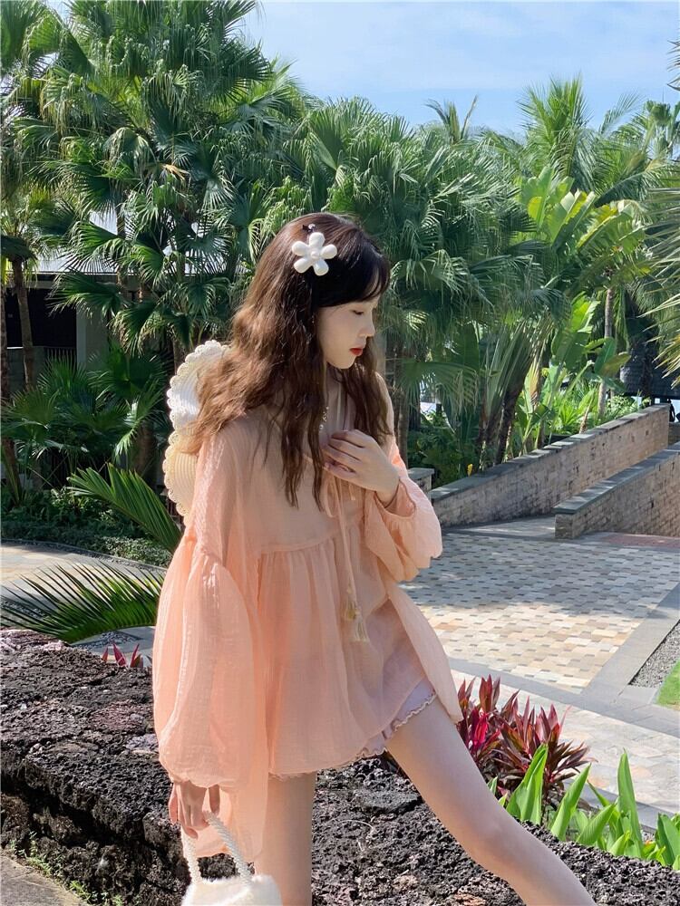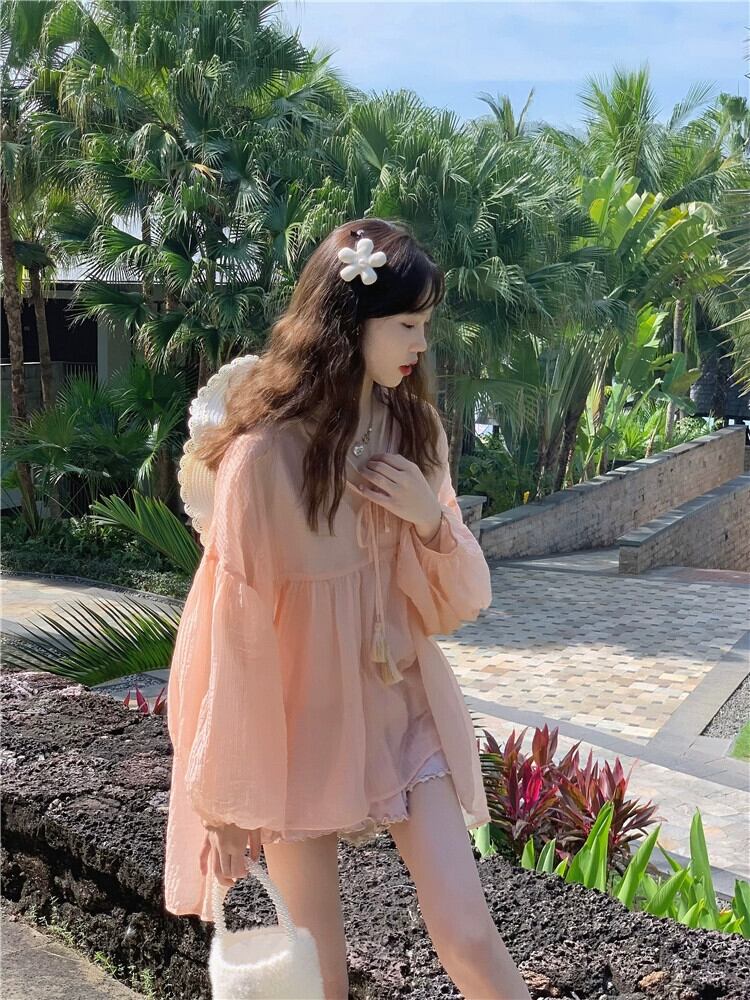 甘い老化を軽減するピンクの V ネック長袖ドレスの女性の 2023 夏の新しい薄いセクションメッシュルーズオールマッチスカート ロング 大人ガーリー スウィート キュート カジュアル サマー 夏物 Vネック 0921974972204008