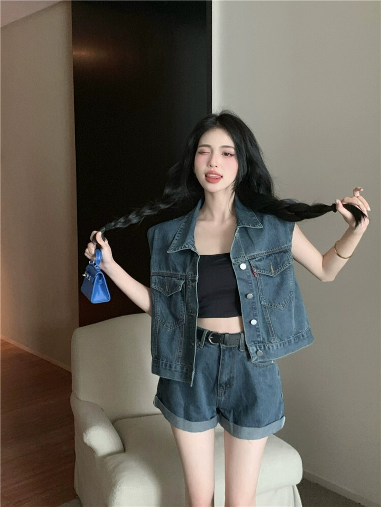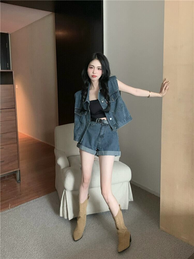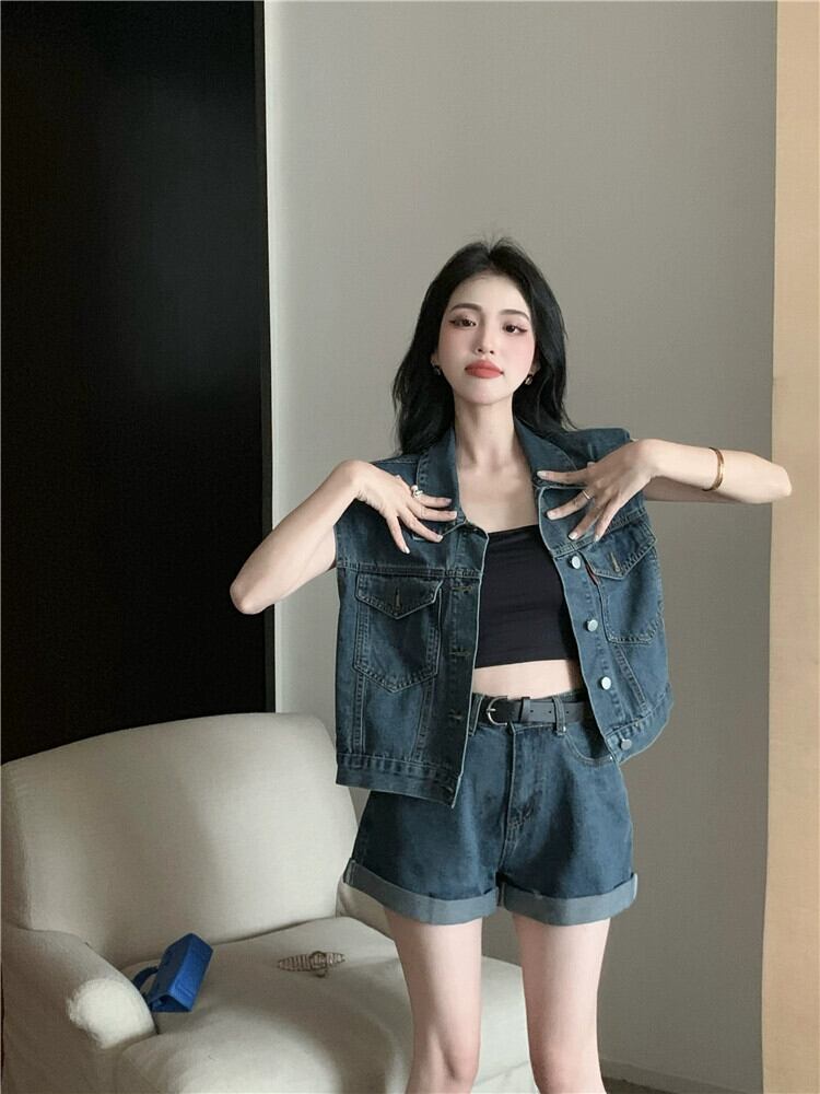 香港スタイルのデニムスーツの女性の 2023 年夏新人格チョッキベストジャケットワイドレッグショーツ 2 点セット サマー 夏物 ブルマー 0921990964598314