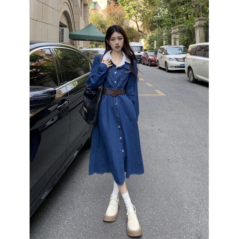 フェイクツーピースステッチシャツカラーデニムドレスレディース2023春新作シングルブレストスリムミドルスカート スプリング 春物 0921992864736445