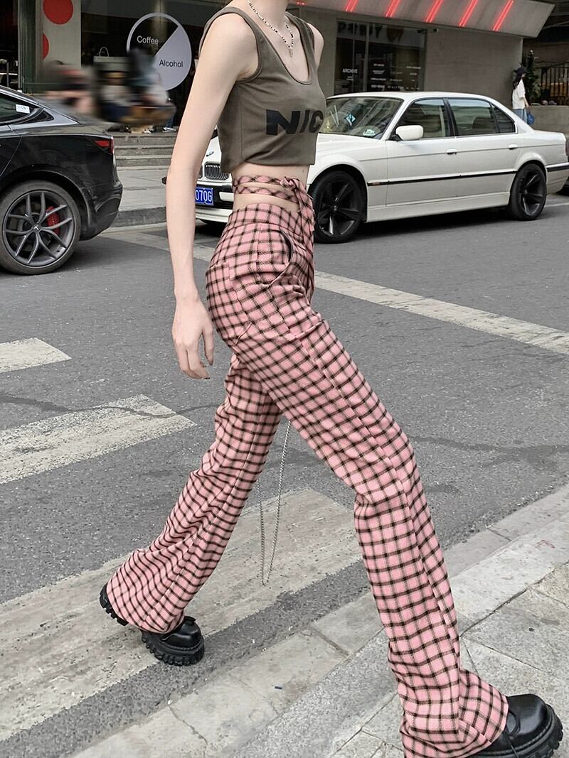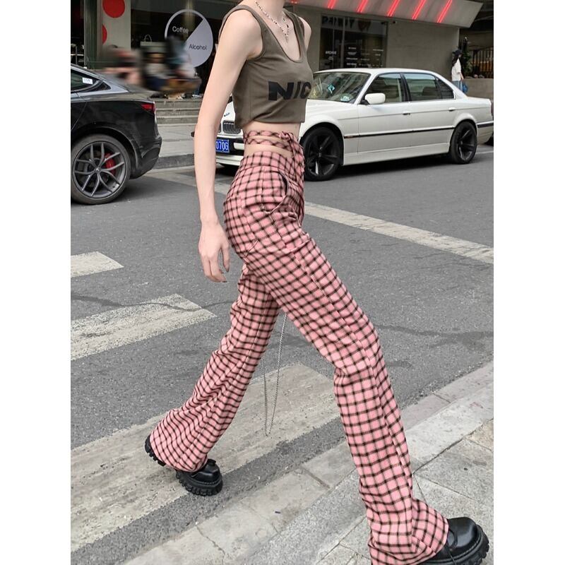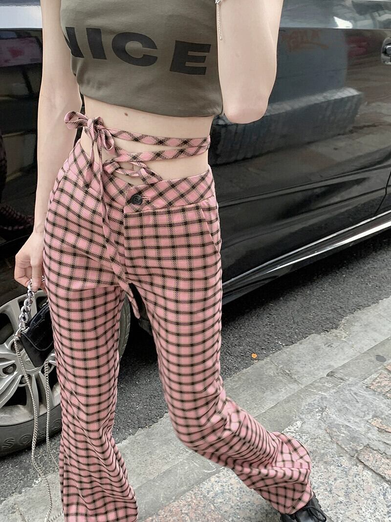 ミレニアムスパイスガールズピンクチェック柄マイクロトランペットパンツ女性の夏 2023 中空アウトウエストウエストモップパンツ サマー 夏物 0921953319987769