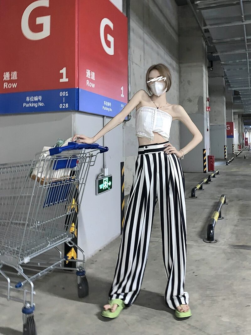 縦ストライプコントラストカラーダブルボタンカジュアルパンツ女性の夏の 2023 新しいオールマッチハイウエスト痩身ワイドレッグスーツパンツ ハイウェスト サマー 夏物 0921979252618435